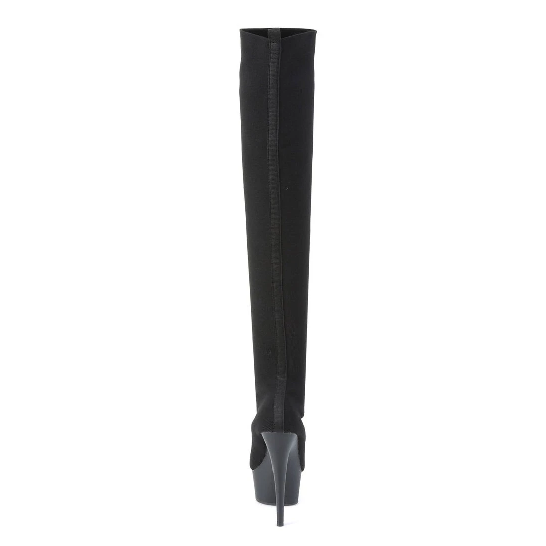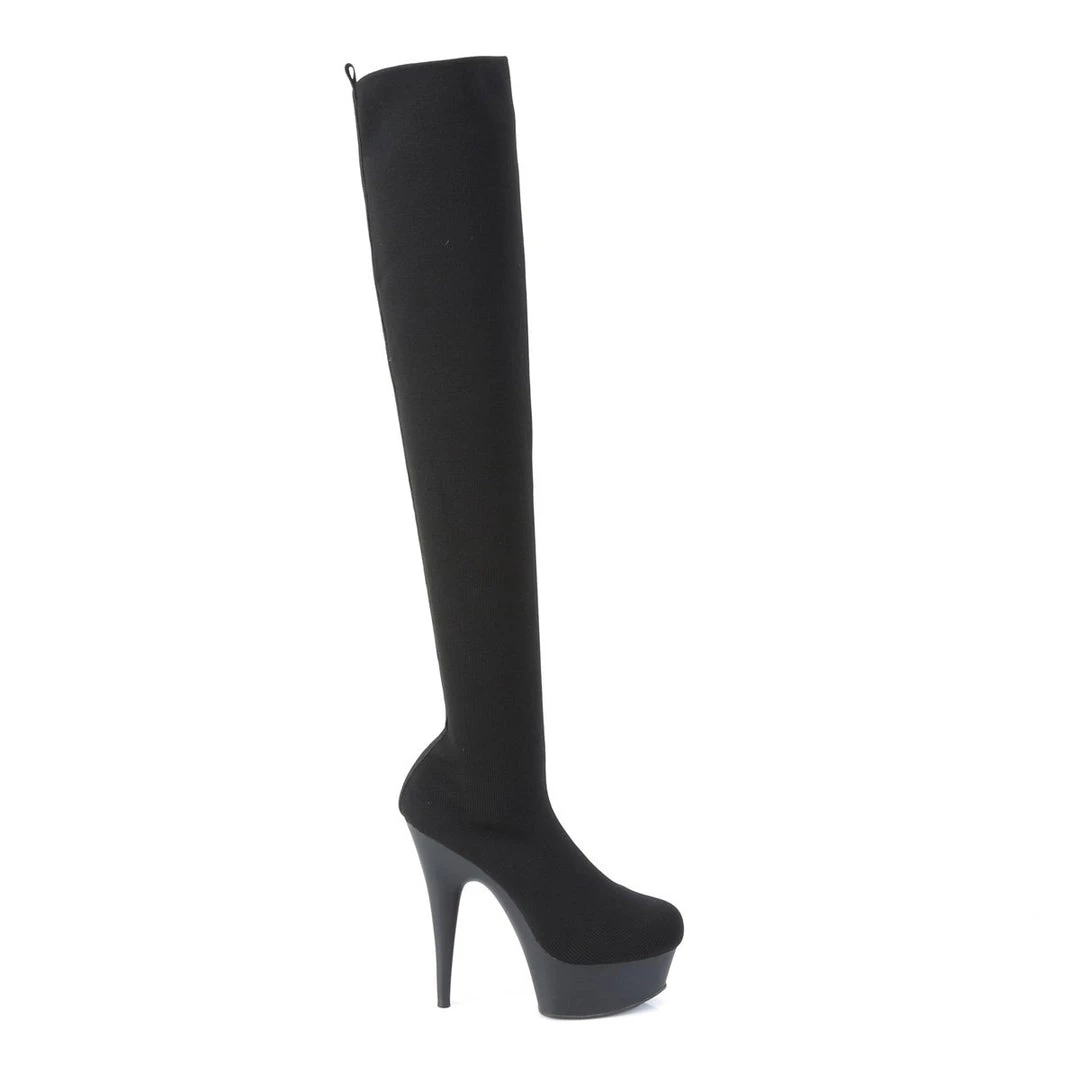 Legs for days! Classic 6″ (152mm) heel, 1 3/4″ (45mm) platform pull-on stretch knit thigh high boot.