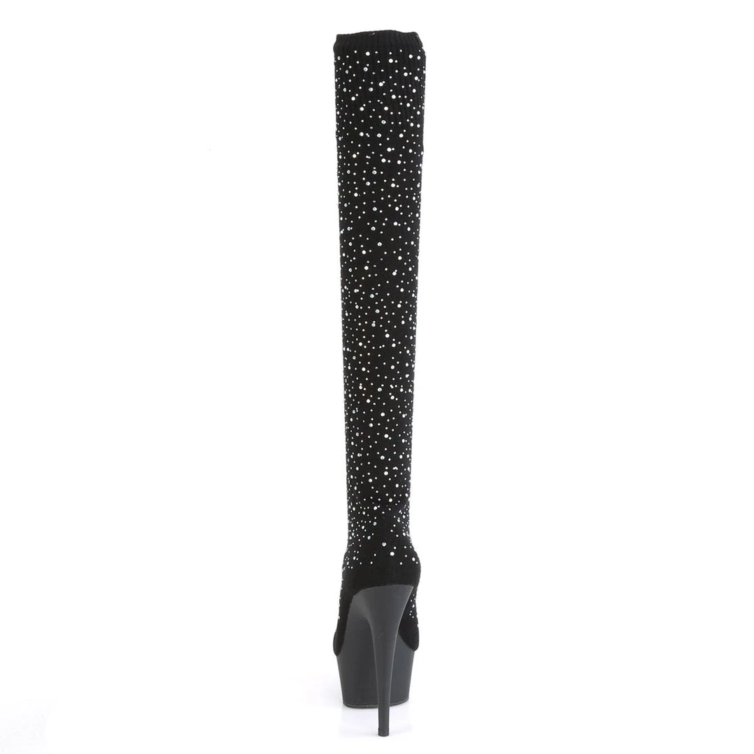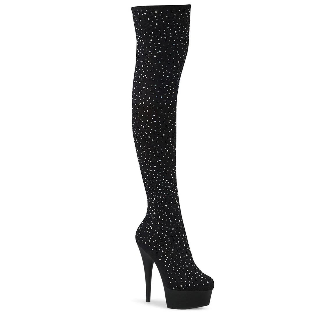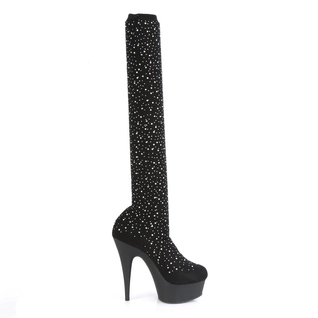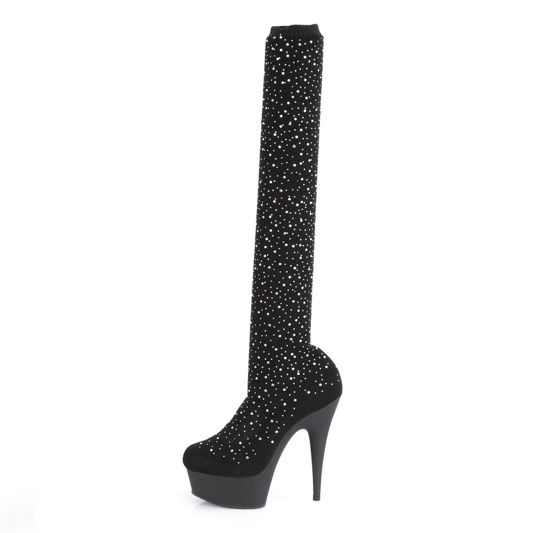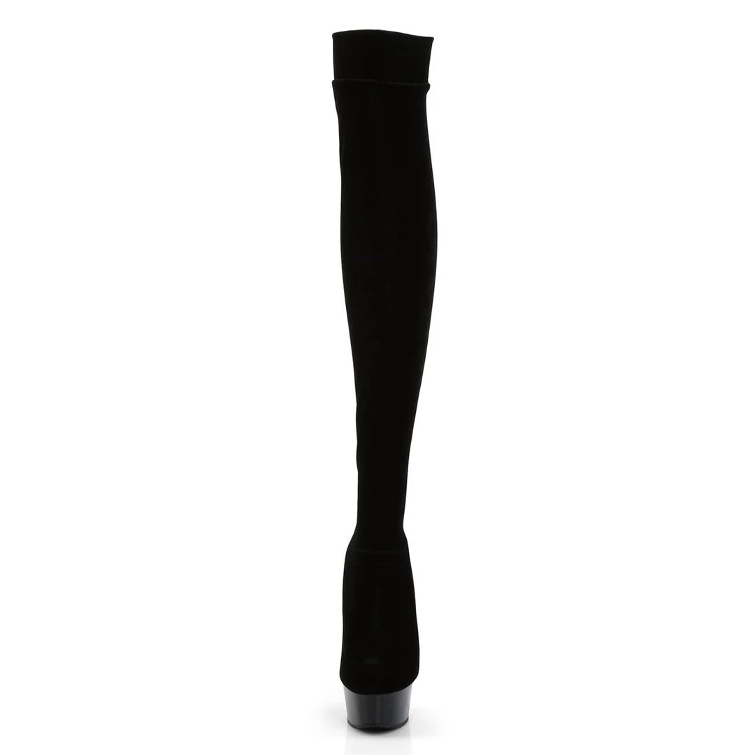 Thigh-high boots crafted in skintight velvety stretch fabric for a perfect fit that will highlight your legs. A front platform balances the 6 inch (11.5 cm) extra high stiletto heels for an effortless wear.