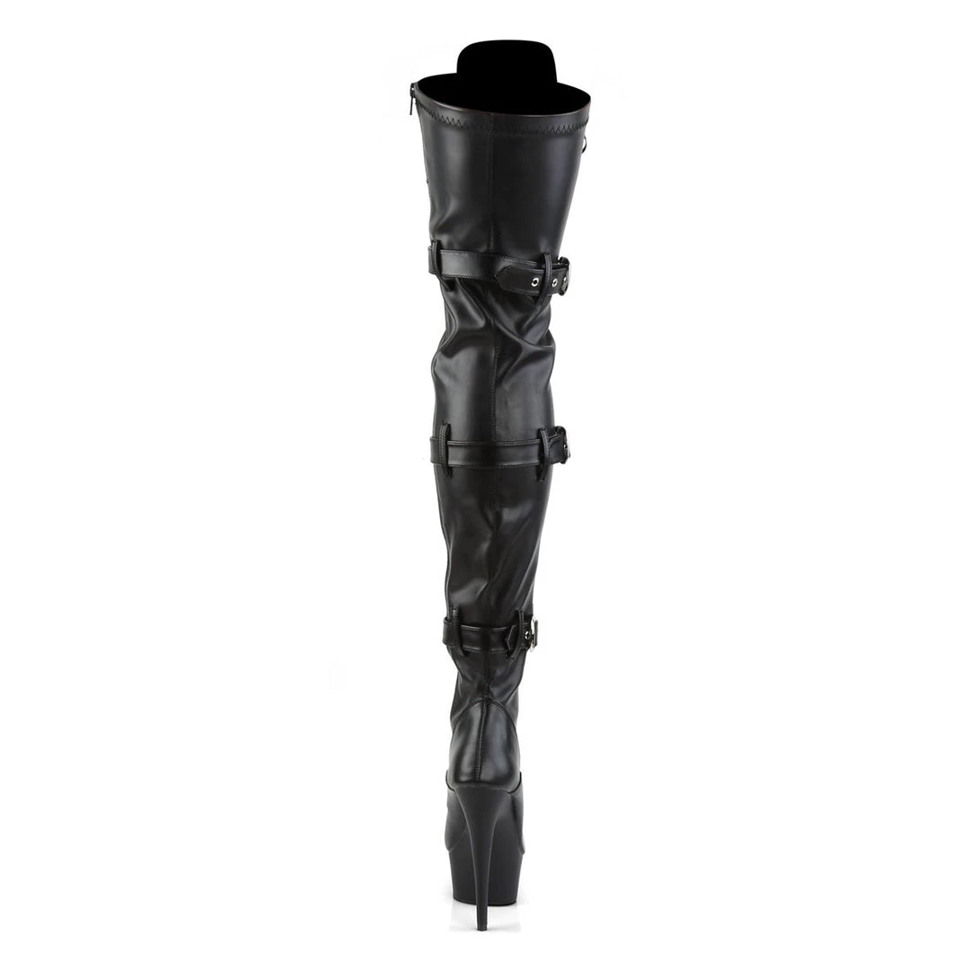 Thigh high platform boots with three straps/buckles, lace-up front and pointed stiletto heel. Discover the ultra sexy, show-stealing Pleaser shoes that are legendary among fashionistas, performers and sexy footwear enthusiasts around the world!