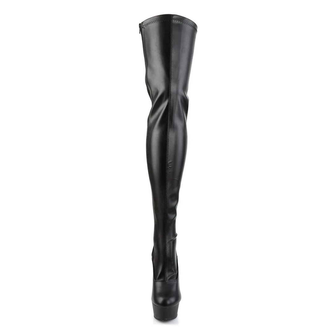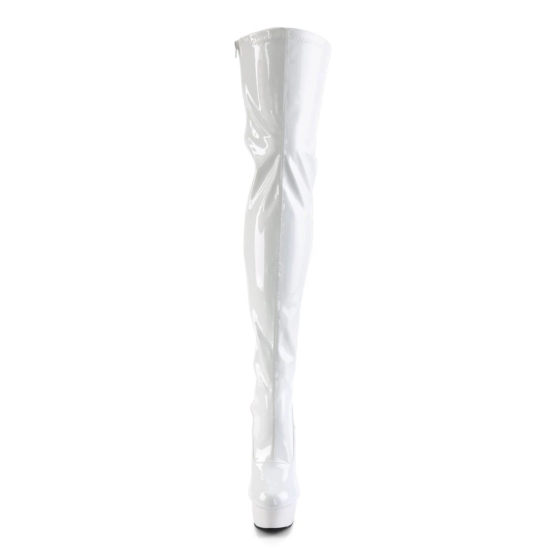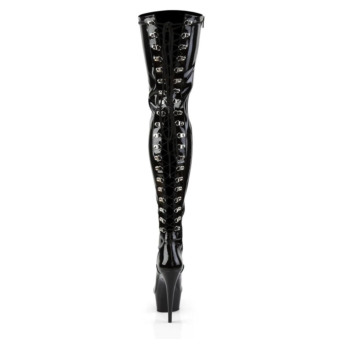 Thigh-high boots with metallic hoops and lace-up detail on the back and side tone-to-tone zipper for easy put on. The look is spiced up by the dazzling 6 inch (15 cm) stiletto heels and by the front black platform which makes their wearing effortless, so that you can make the most of them!