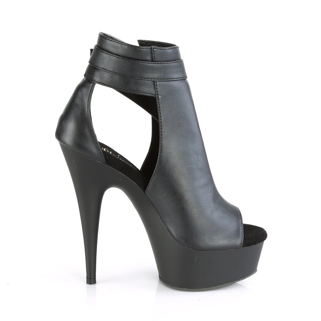 Sleek 6″ (152mm) heel, 1 3/4″ (45mm) platform peep toe close back ankle bootie sandal featuring a buckle ankle strap closure.