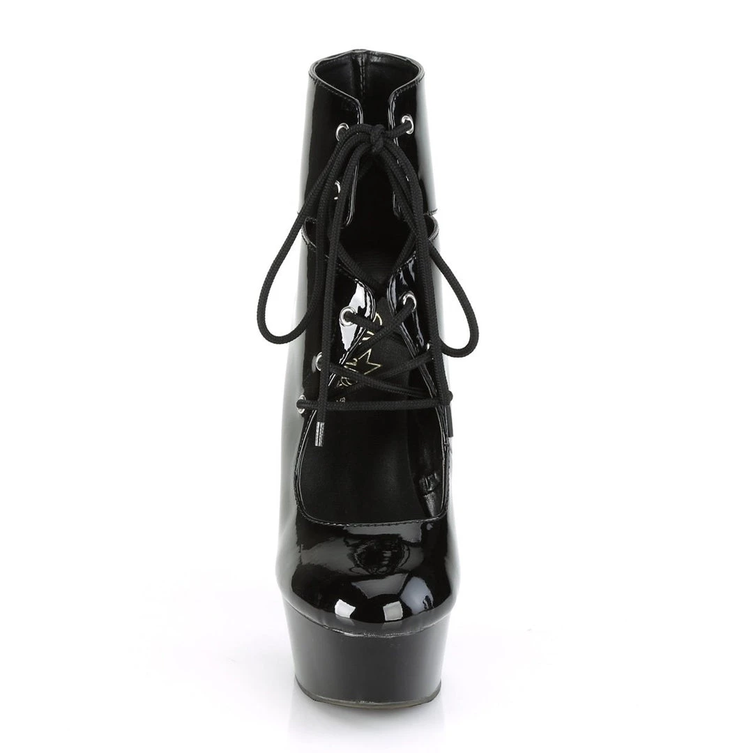 Seductive 6″ (152mm) heel, 1 3/4″ (45mm) platform cutout ankle bootie pump featuring lace-up ties at front.
