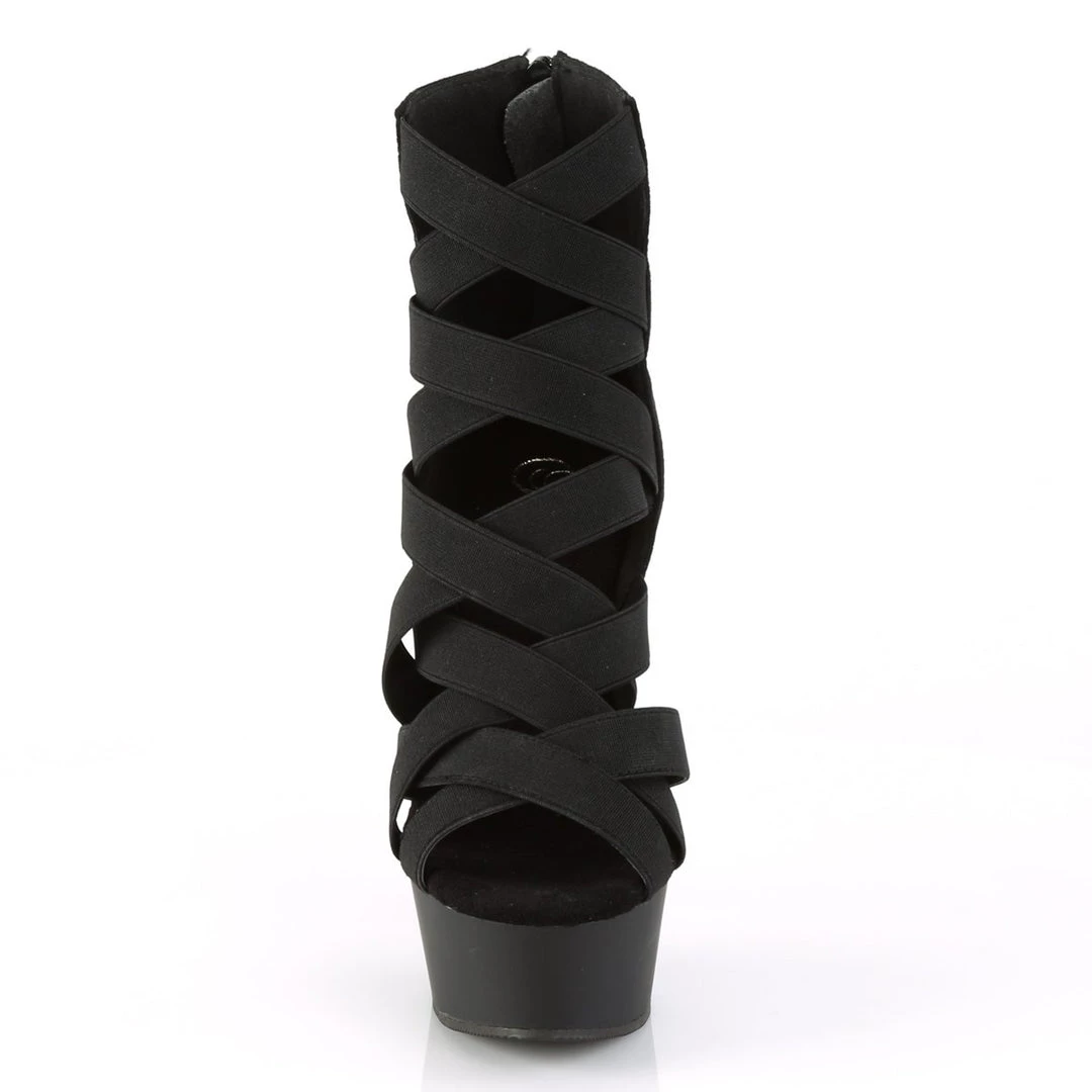 Sleek & sexy 6″ (152mm) heel, 1 3/4″(45mm) platform cage style open toe lattice design bootie sandal with criss cross elastic straps with back zip closure.