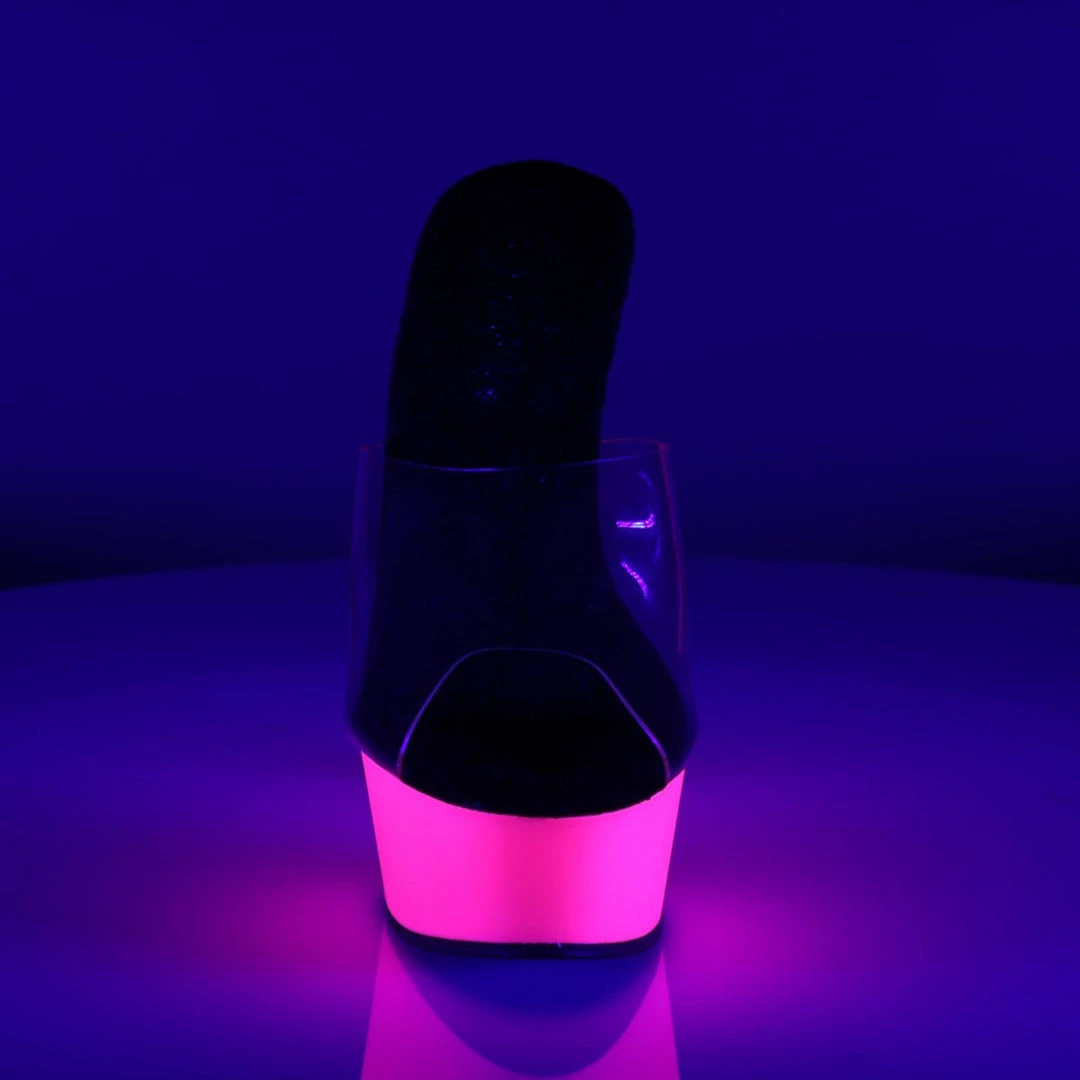 A clear synthetic upper with an open toe for a sassy approach. Beneath, a generous platform lifts, while the high stiletto heel delivers the leggy look you love. This slide sandal on a platform heel features a delightful pointed stiletto heel with 1 3/4″ front platform rise.
