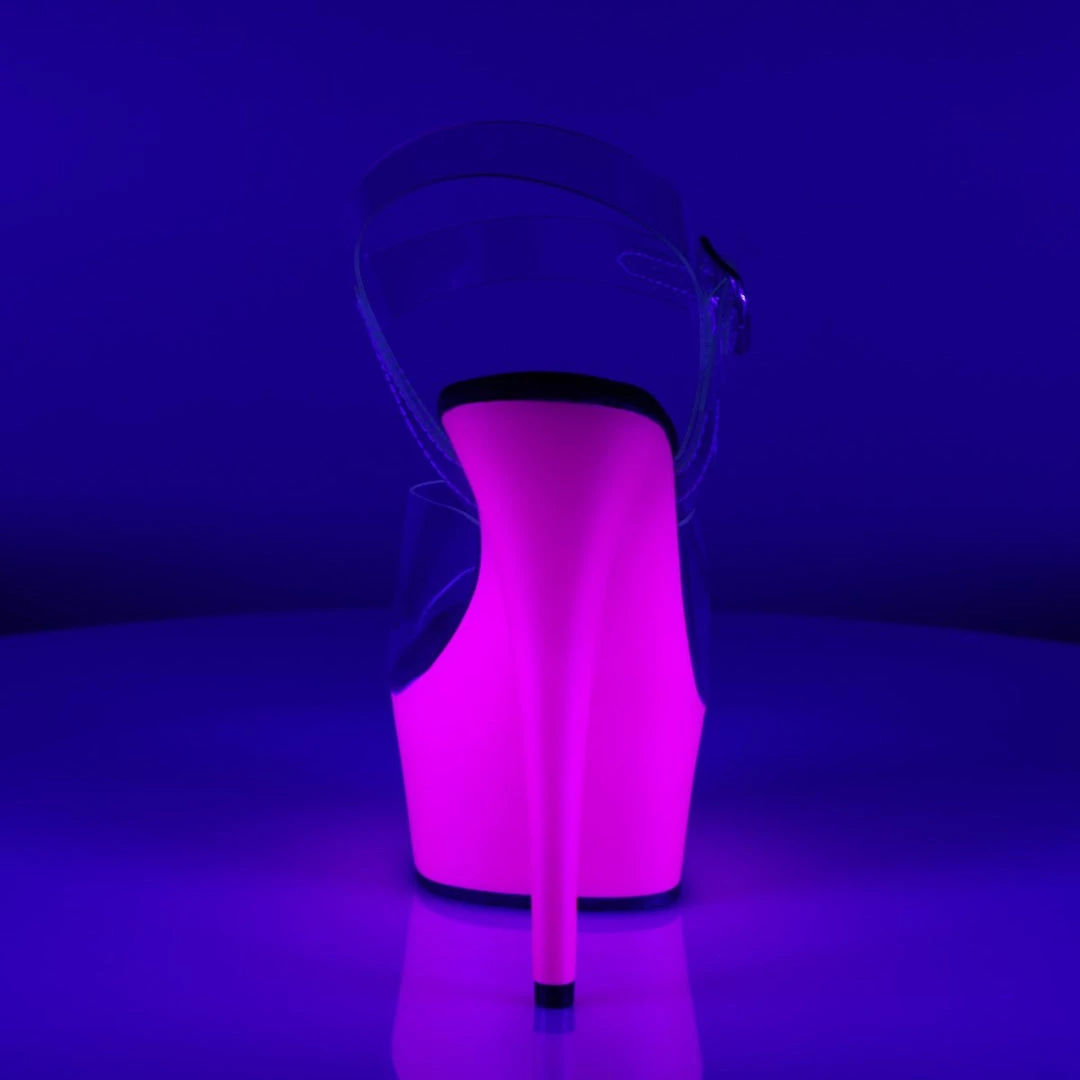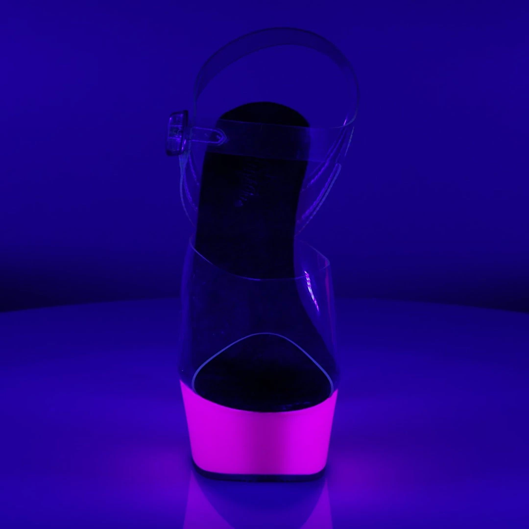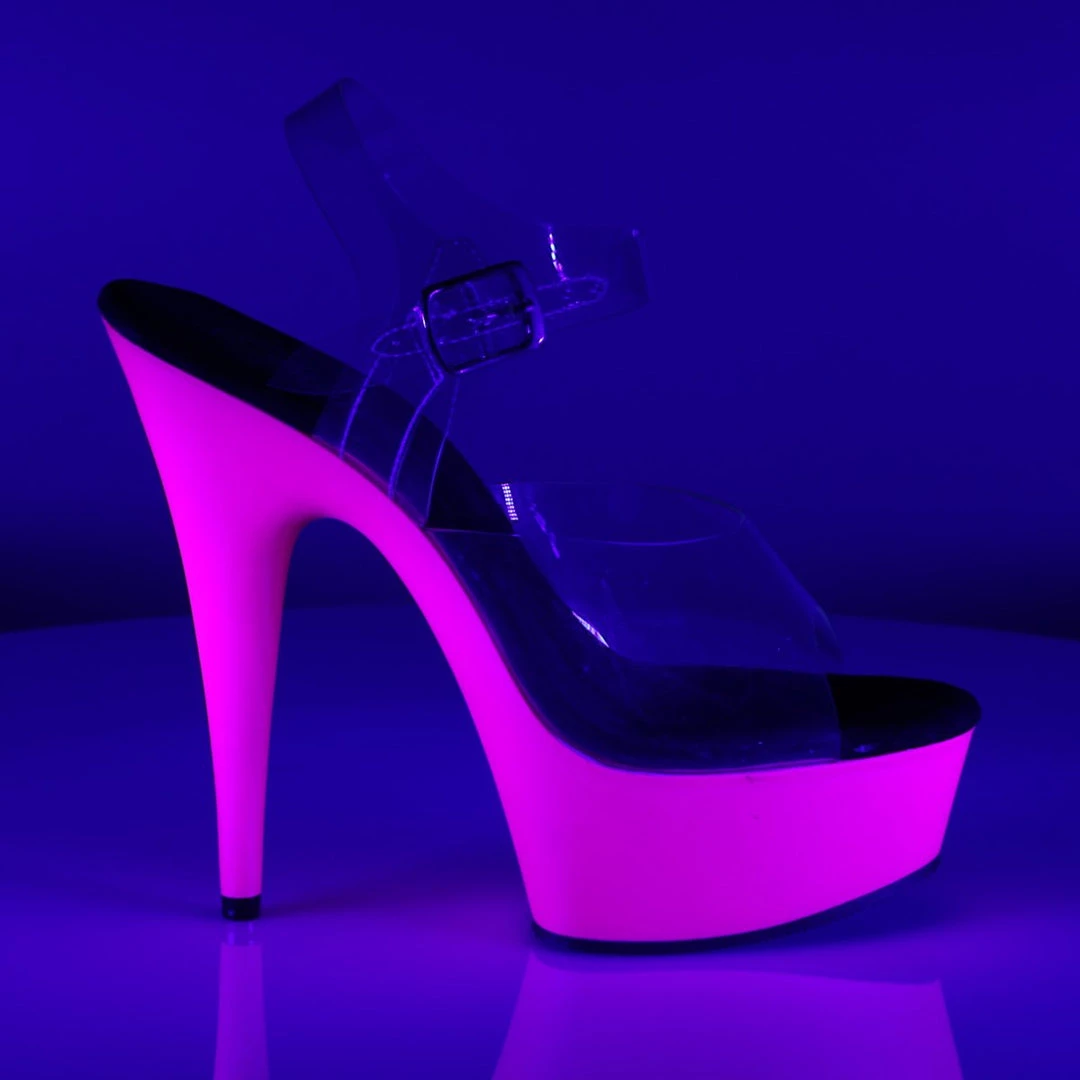 A Ultraviolet Reactive Neon Colored Bottom slide with 6 Inch Heel, 1.75 Inch Platform. They feature wide toe strap, two side straps which support an ankle strap with metallic buckle side closing. The inner sole is padded with soft fabric for added comfort and great feel.