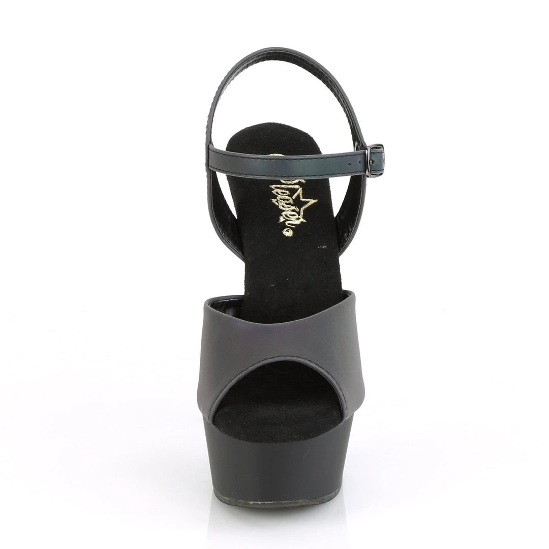 Gorgeous 6″ (152mm) heel, 1 3/4″ (45mm) platform ankle strap sandal featuring reflective effect upper.