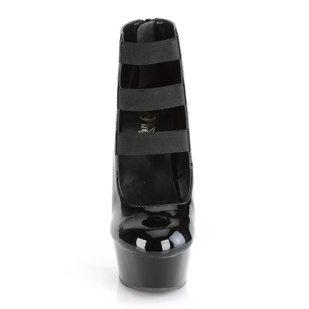 Sleek 6″ (152mm) heel, 1 3/4″ (45mm) platform tri-strap Mary Jane style ankle bootie with back zip closure.