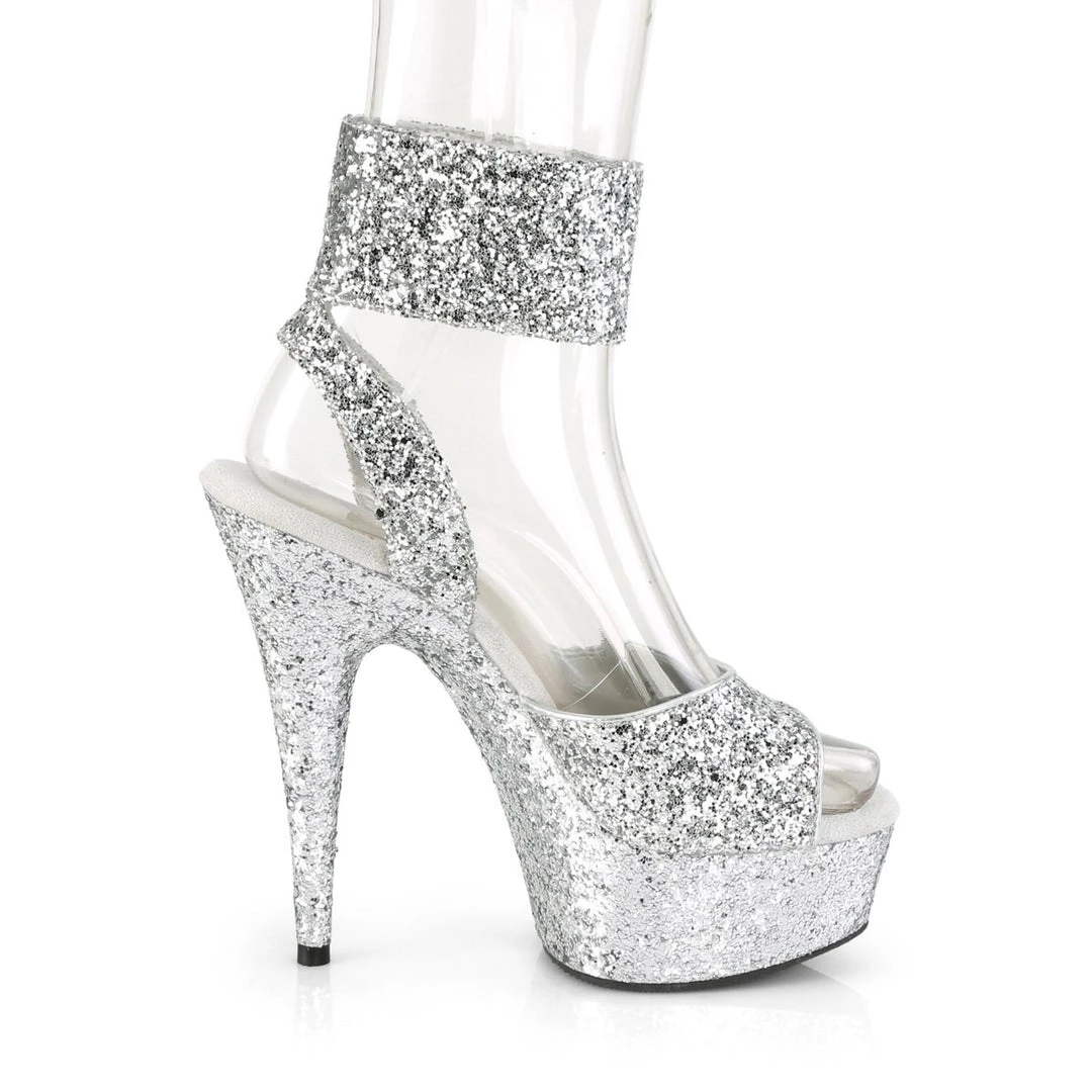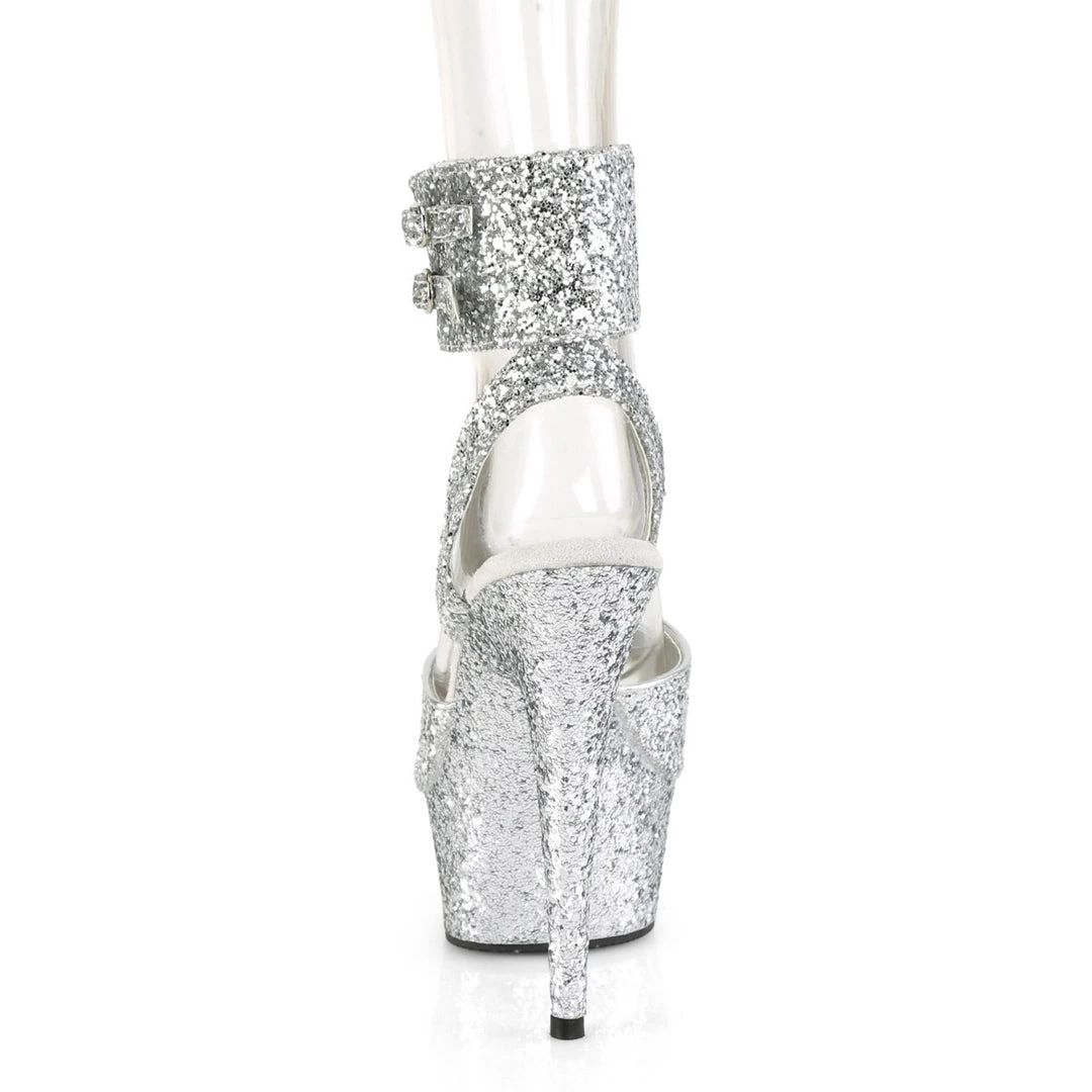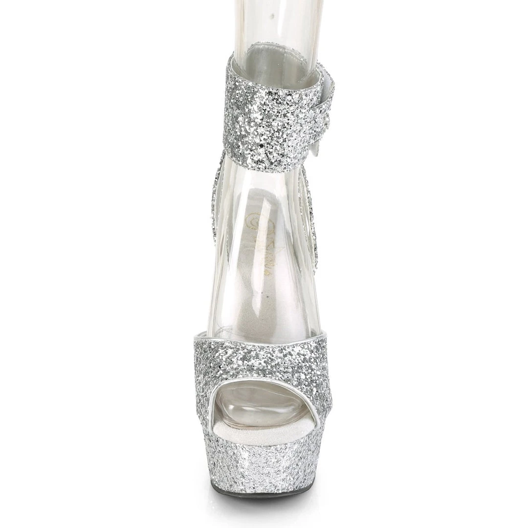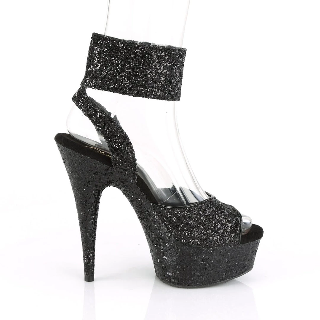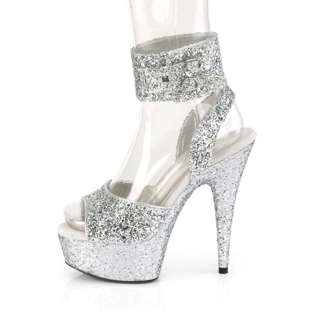 Sparkle the night away in these gorgeous 6″ (152mm) heel, 1 3/4″ (45mm) platform glitter ankle strap sandals featuring wide ankle band with dual buckle straps.