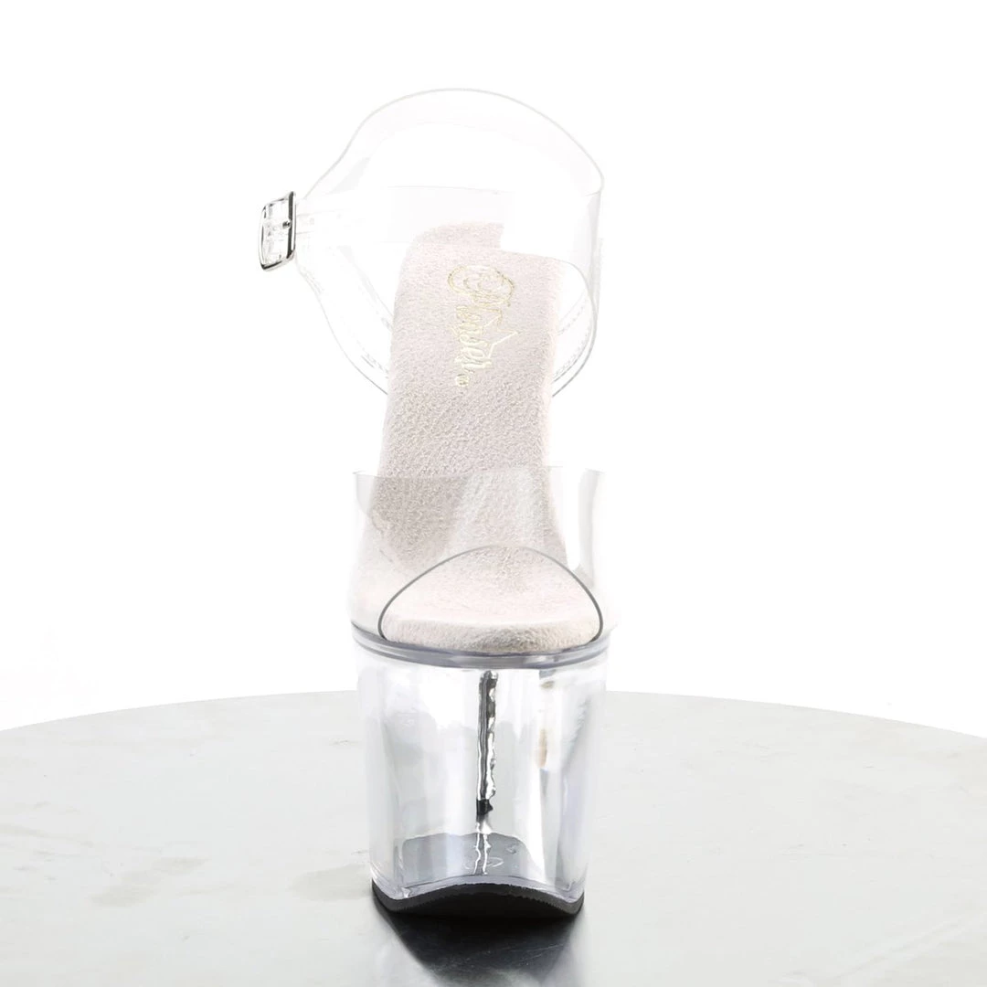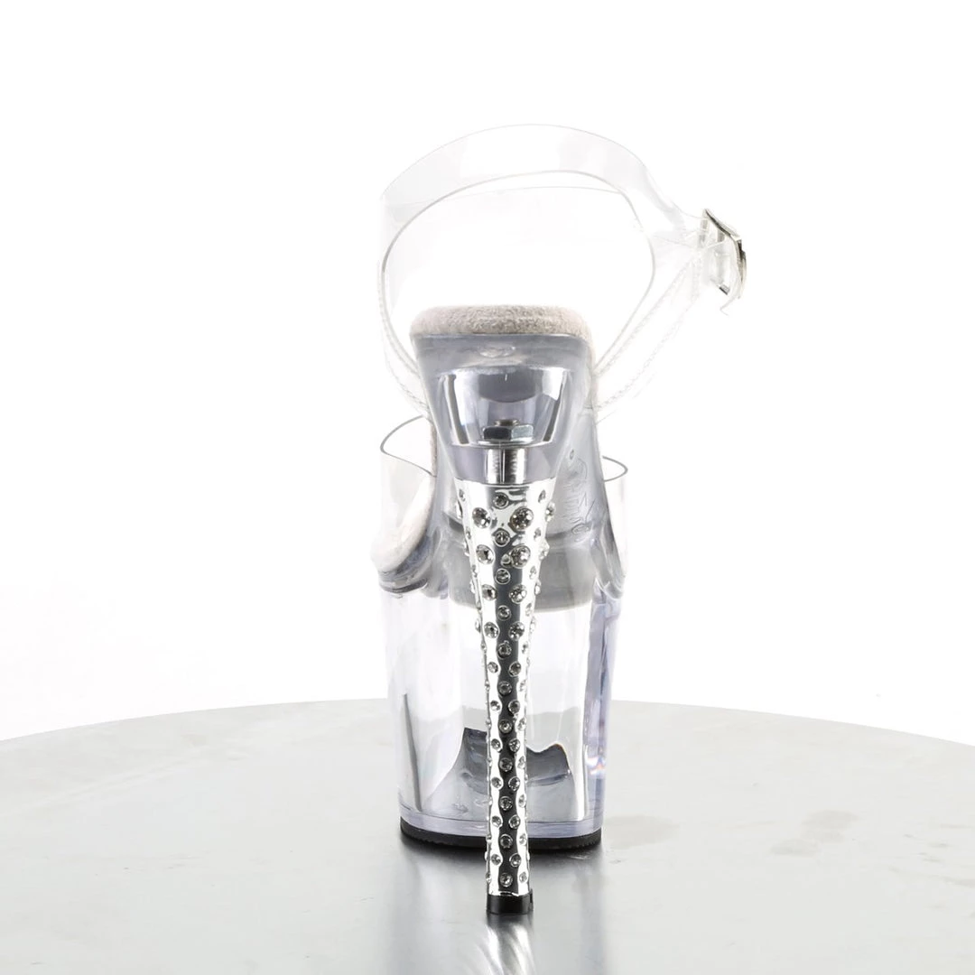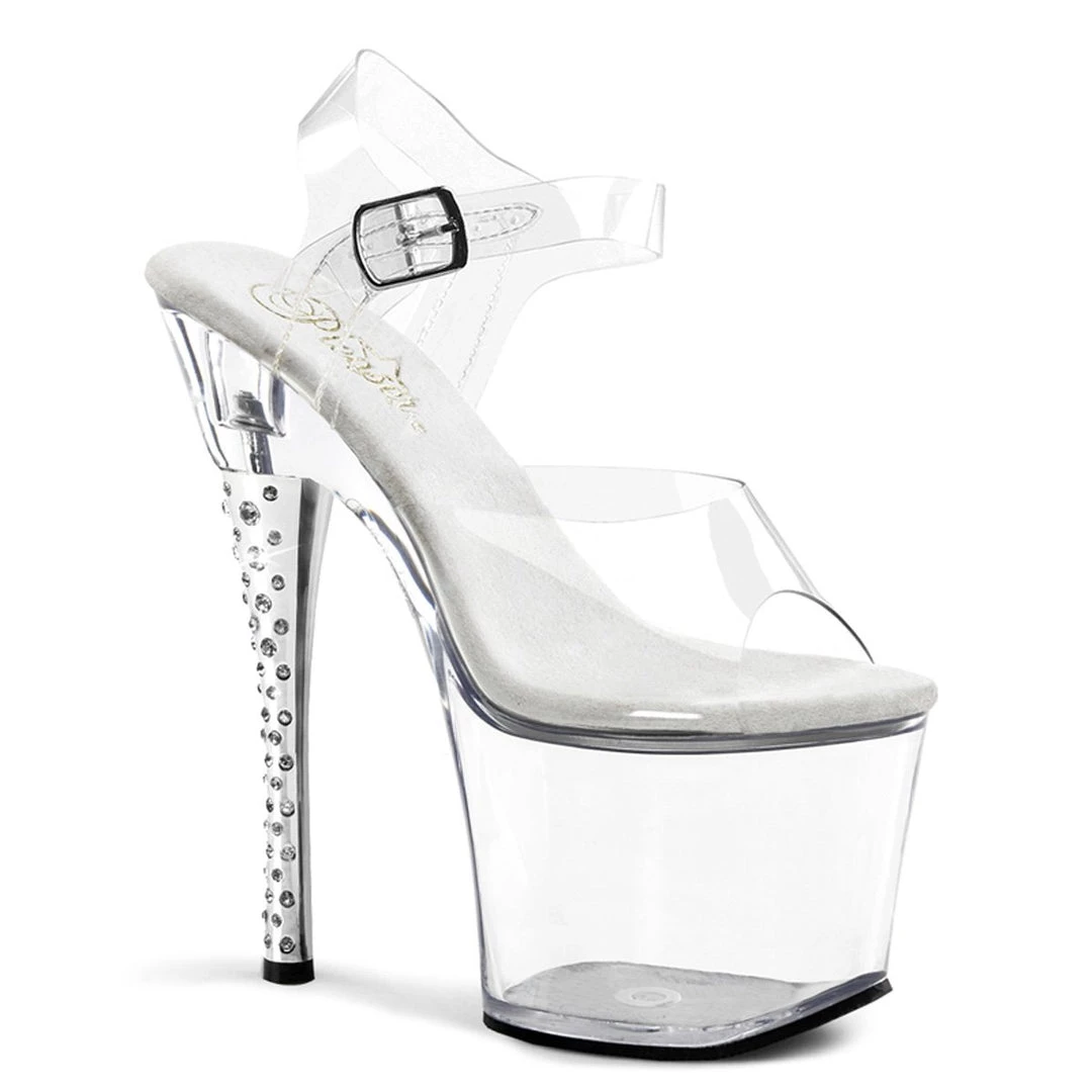 Play with transparency for a provocative look. These all clear sandals will help you achieve a sexy look, without sacrificing your comfort. They feature wide toe strap, two side straps which support an ankle strap with metallic buckle side closing, Rhinestone Imbedded matching clear 7 inch high heels and front clear platform with 3.25 inch height.