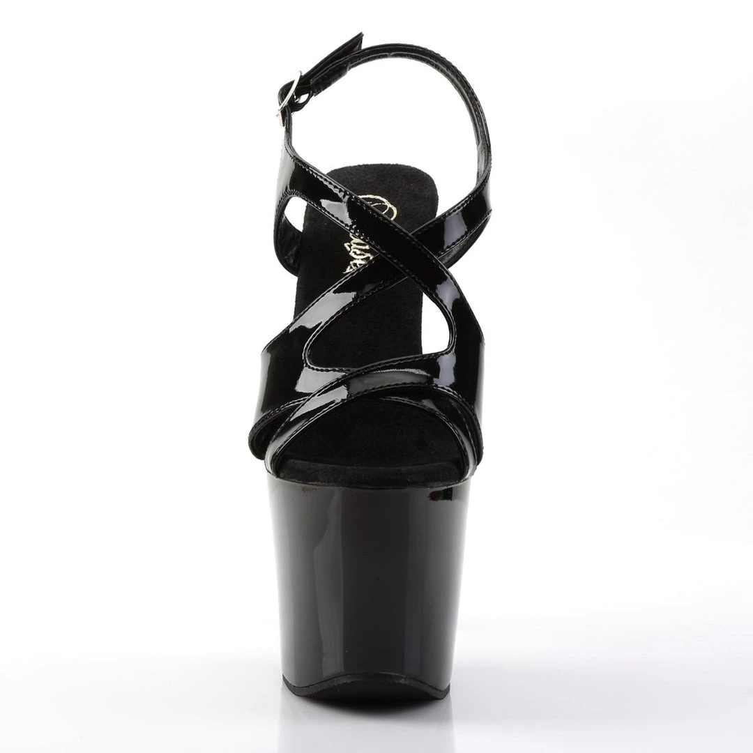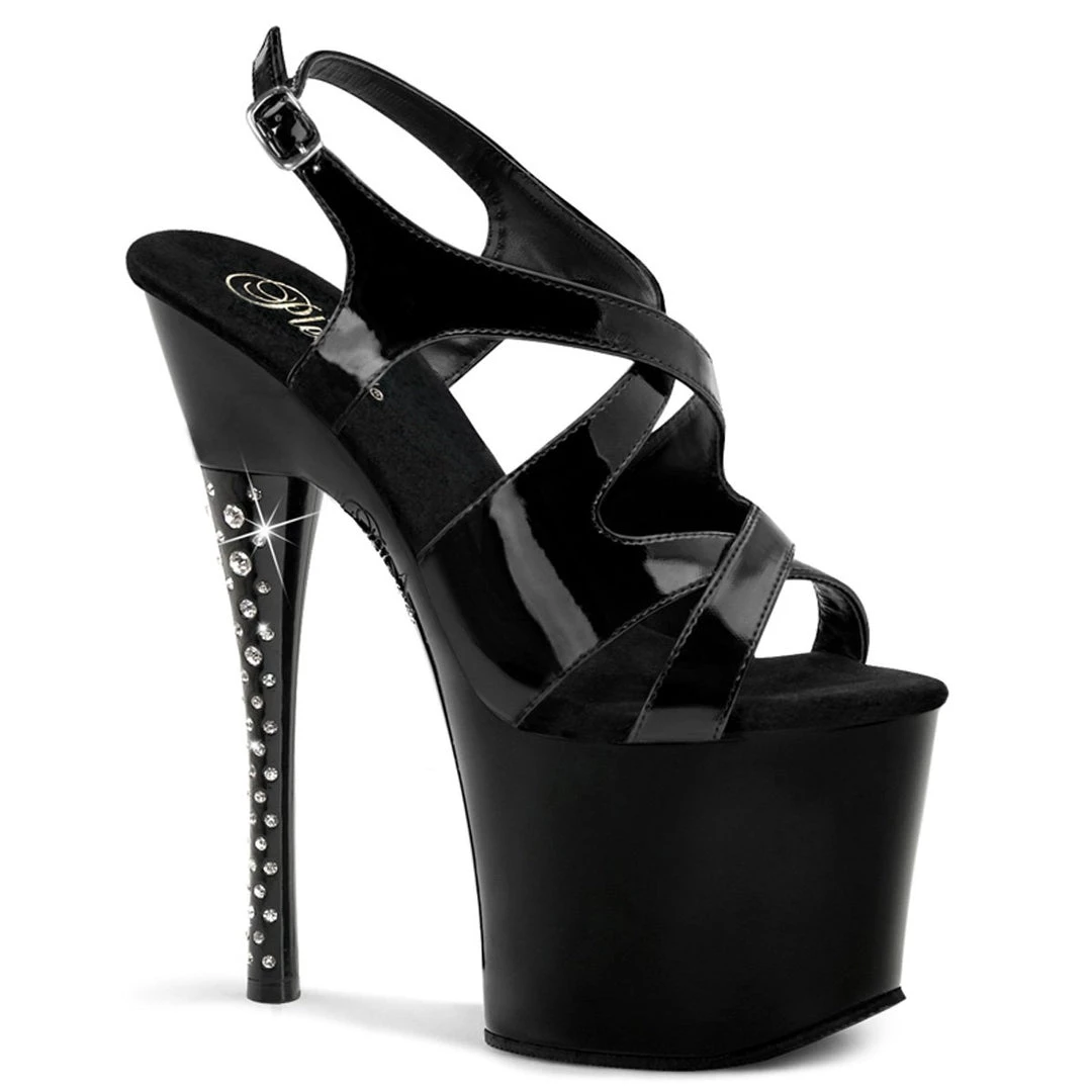 This slingback features an adjustable strap and rhinestone encrusted 7 heel with criss-cross straps.