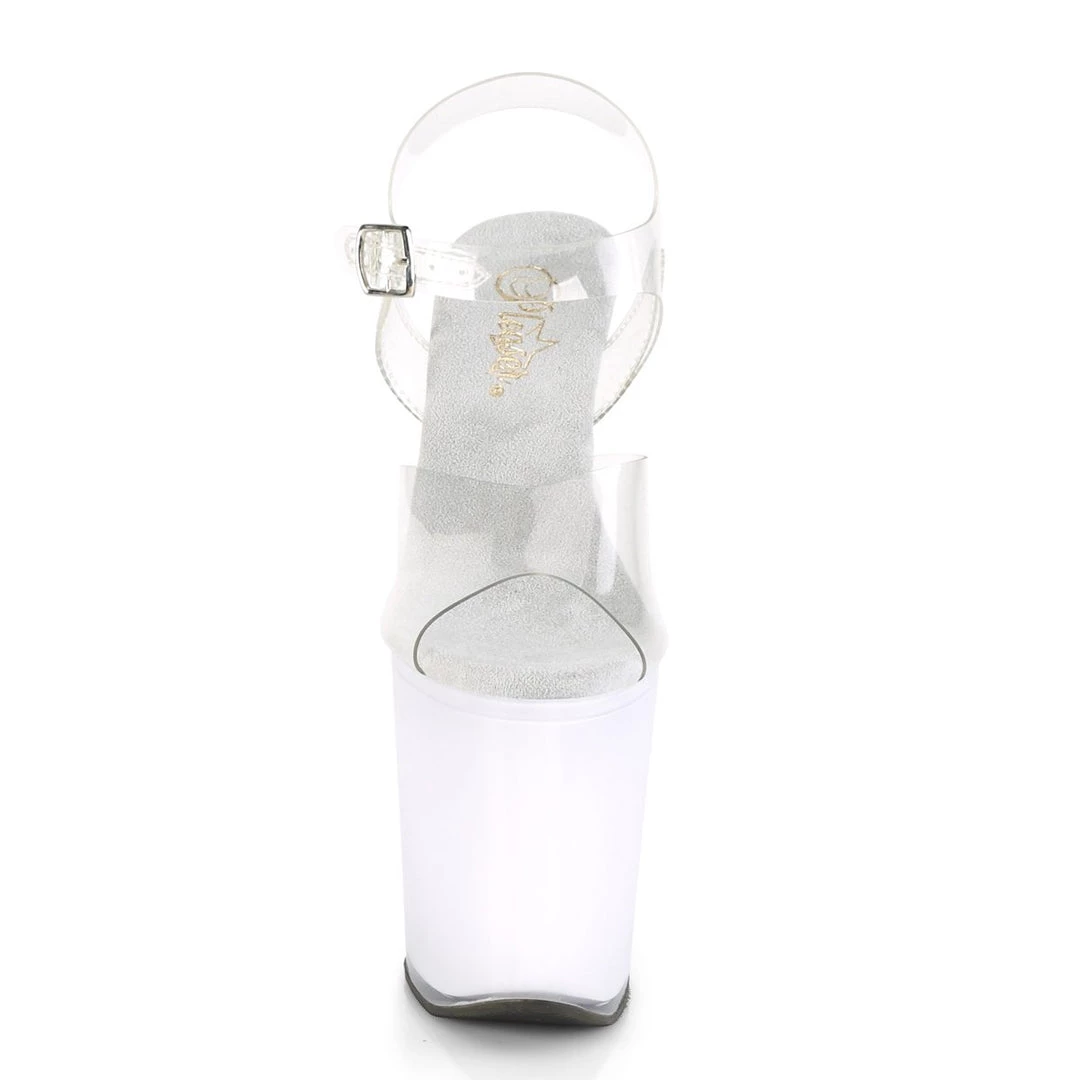 Have a little fun in these sexy 8″ (200mm) heel, 4″ (100mm) platform USB chargeable LED light-up ankle strap sandal with multi color disco lighting effects in various patterns and settings.