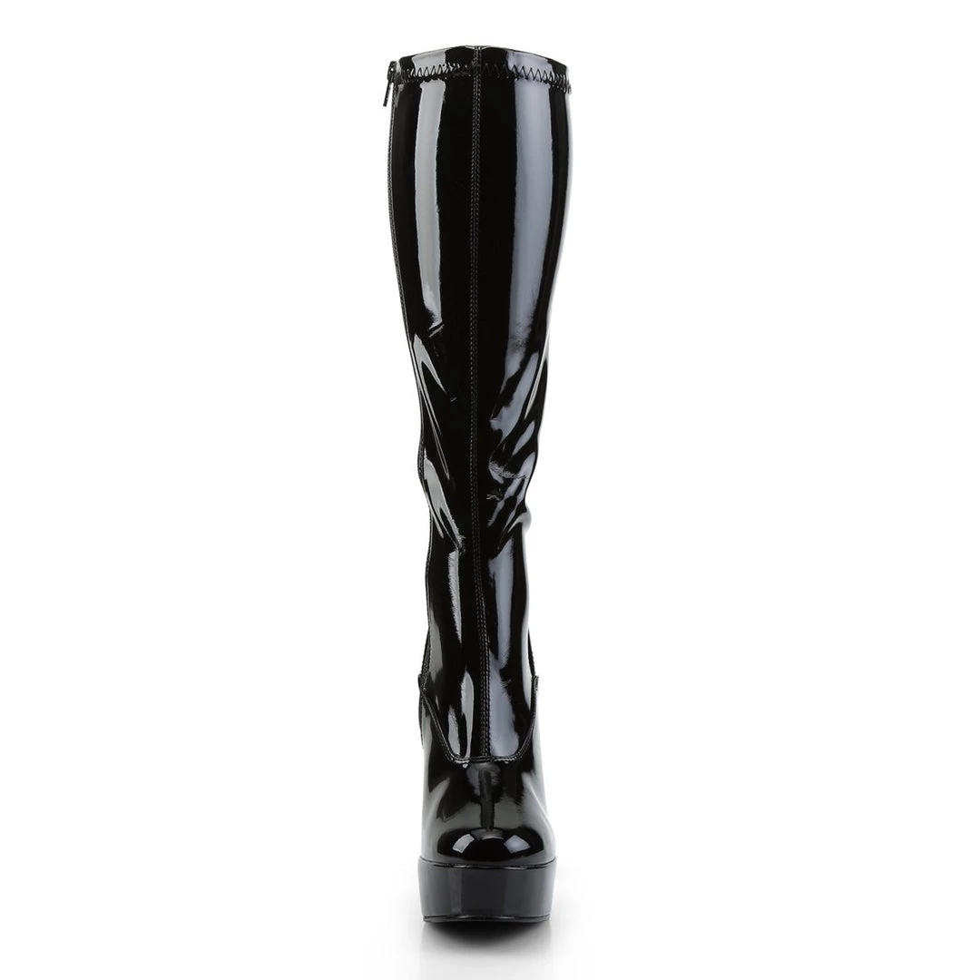 Pull-on boots with stretch top that wraps the leg for a perfect fit, preformed bottom for a comfortable wear, 5.5 inch (14 cm) ’70s style heels and a matching front platform which measures 1.5 inch (4 cm). Stable, comfortable and provocative, they are perfect for dress-ups and thematic looks.
