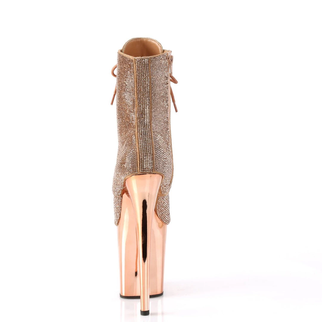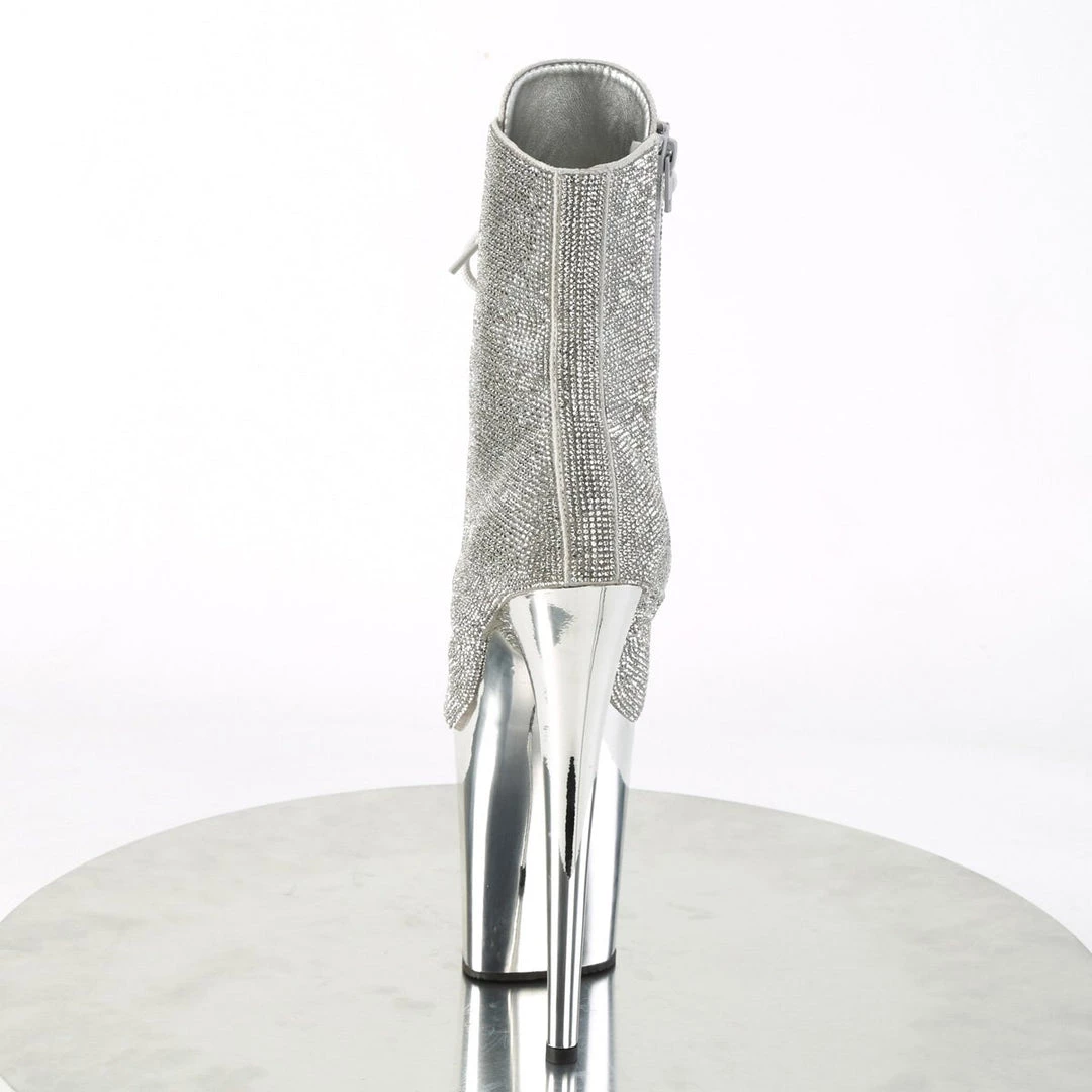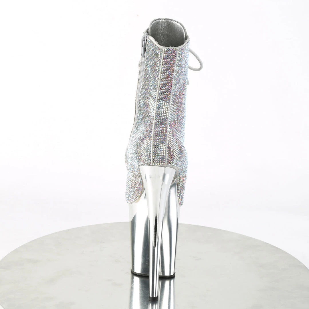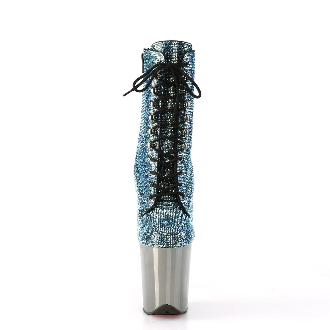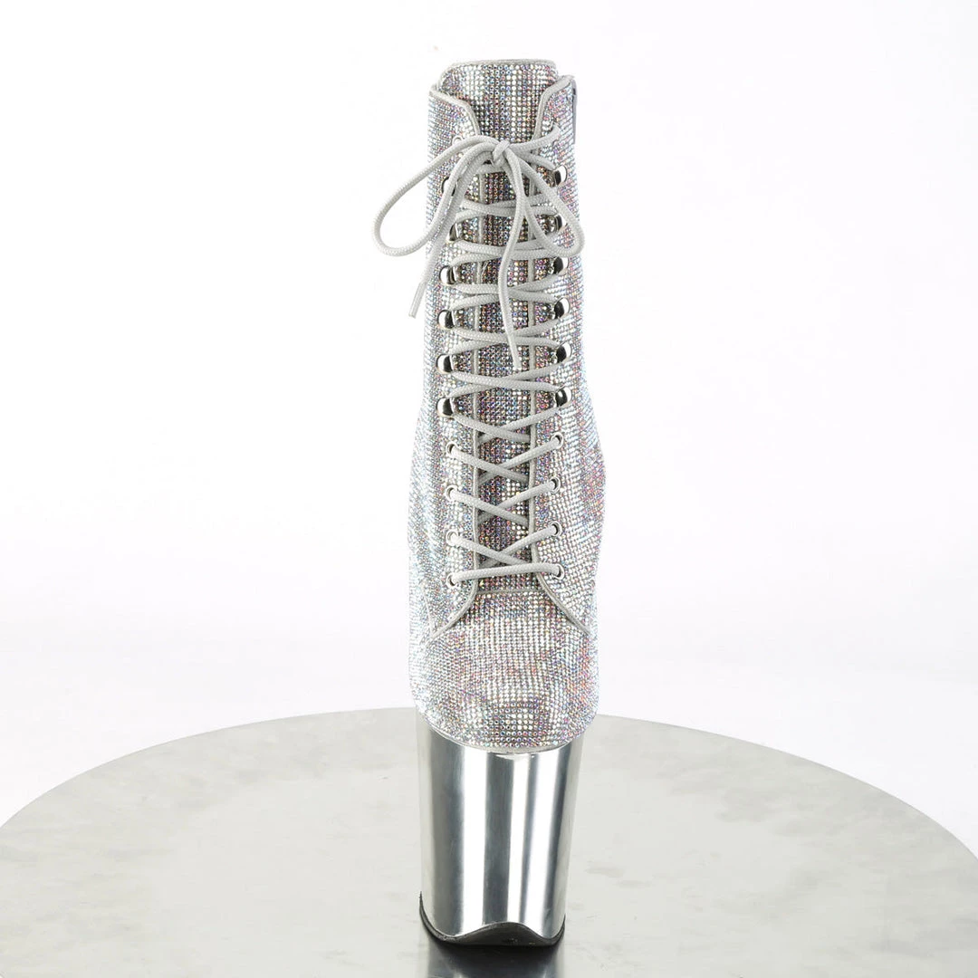 Sparkle in these stunning 8″ (200mm) heel, 4″ (100mm) platform lace-up front ankle boots featuring allover blanketed rhinestone embellishments on upper and chrome plated platform bottom with inside zip closure.