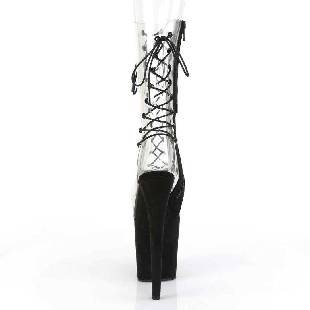 Stunning 8″ (200mm) heel, 4″ (100mm) platform lace-up front/back open toe/heel mid calf boot featuring fully wrapped platform bottom with inside zip closure.