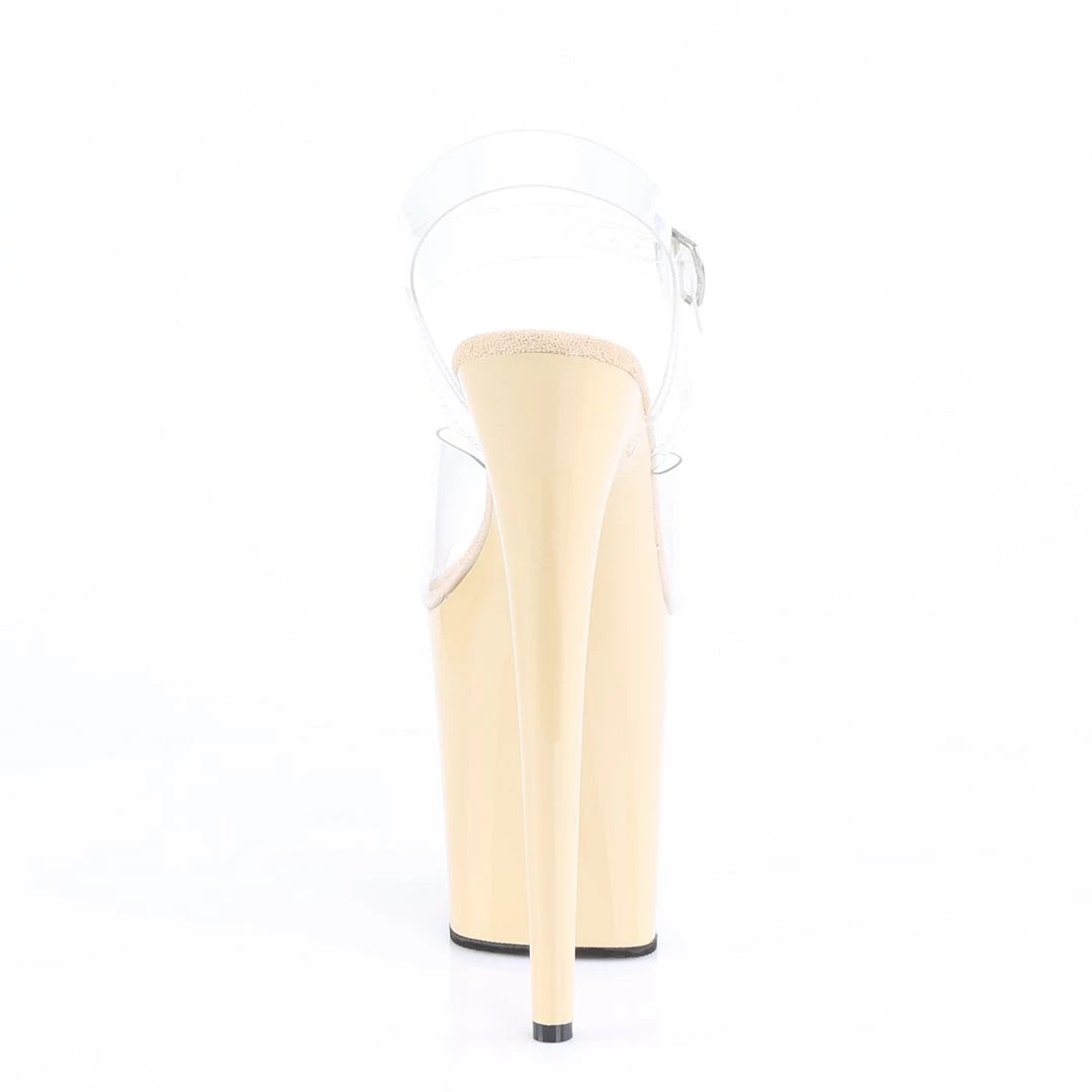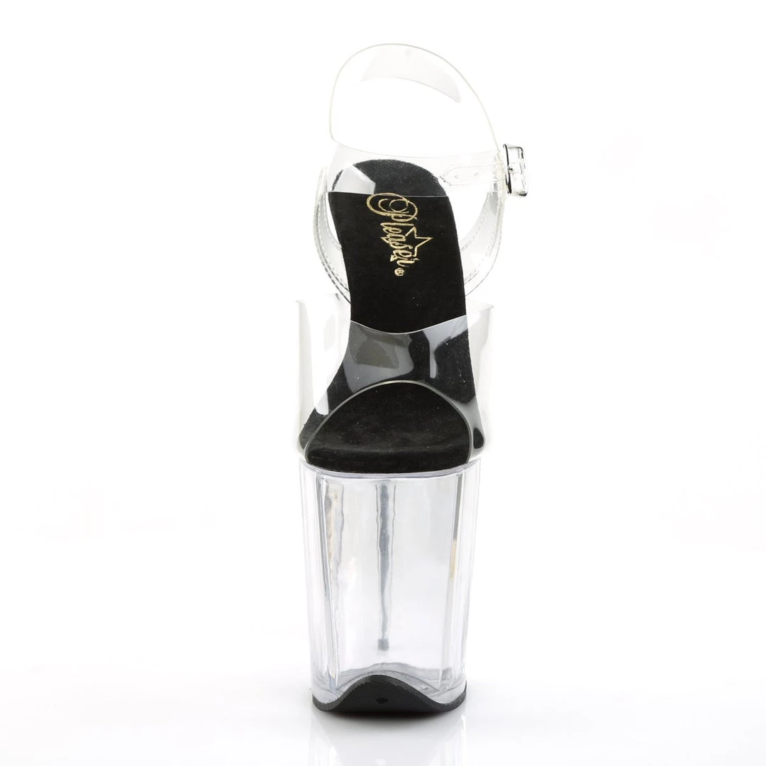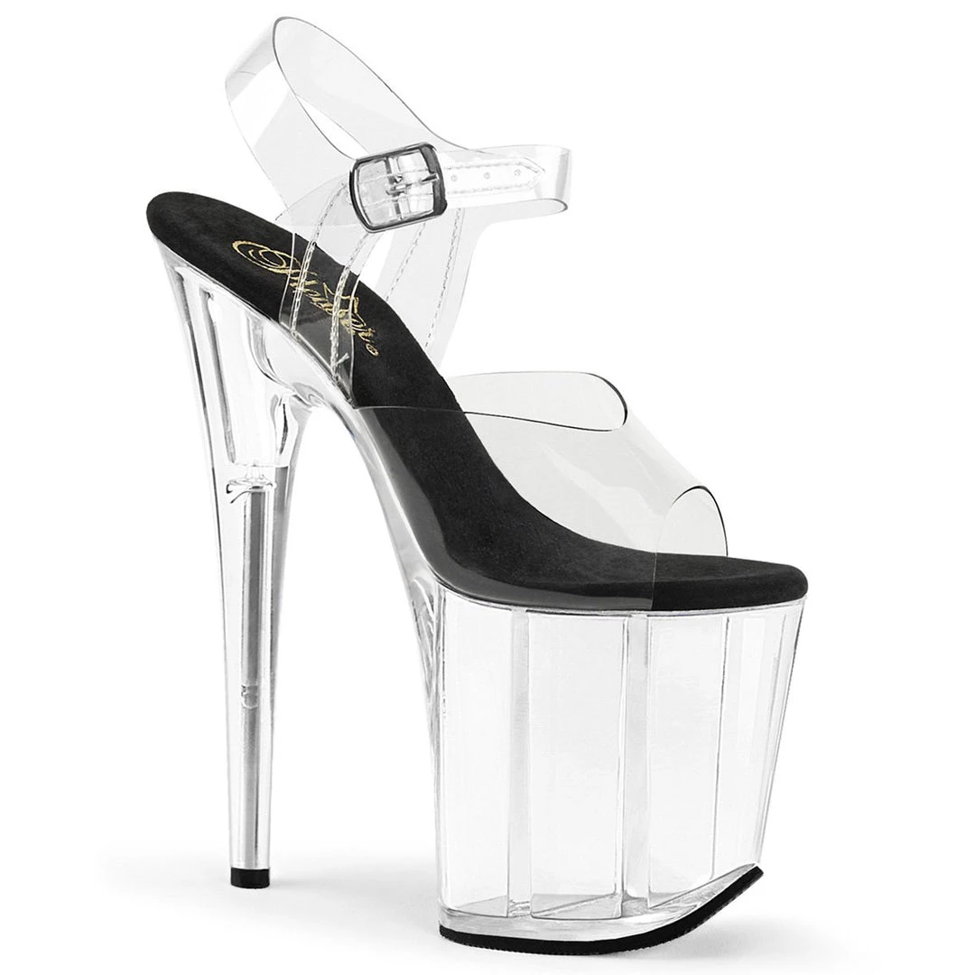 These all clear sandals will help you achieve a sexy look, without sacrificing your comfort. They feature wide toe strap, two side straps which support an ankle strap with metallic buckle side closing, matching clear 8 inch high heels and front clear platform with 4 inch height.