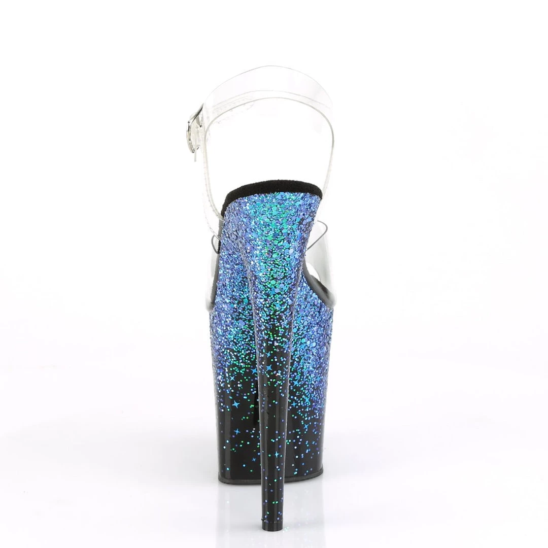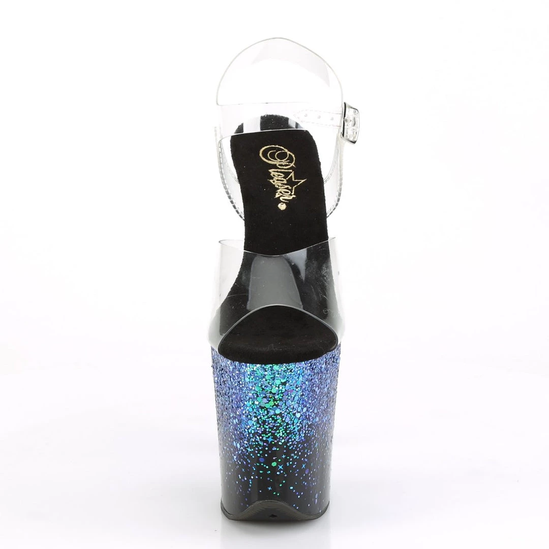 Beautiful 8″ (200mm) heel, 4″ (100mm) platform ankle strap sandal with holographic gradient effect on the platform bottom.