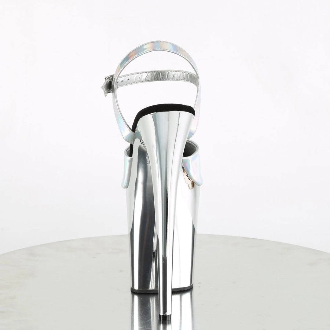 Stand tall in these gorgeous 8″ (200mm) heel, 4″ (100mm) platform ankle strap sandals with chrome plated platform bottom.
