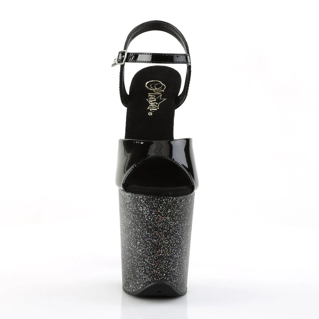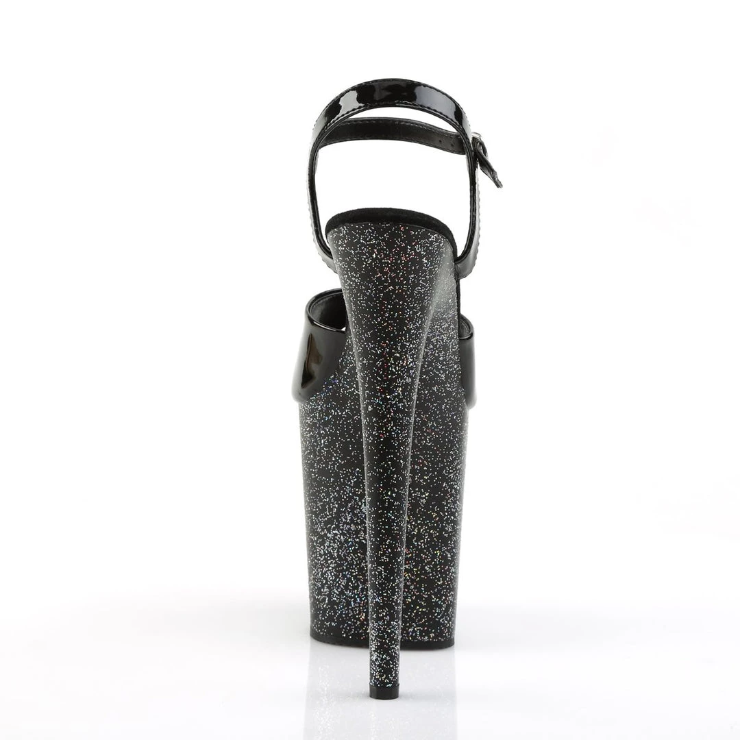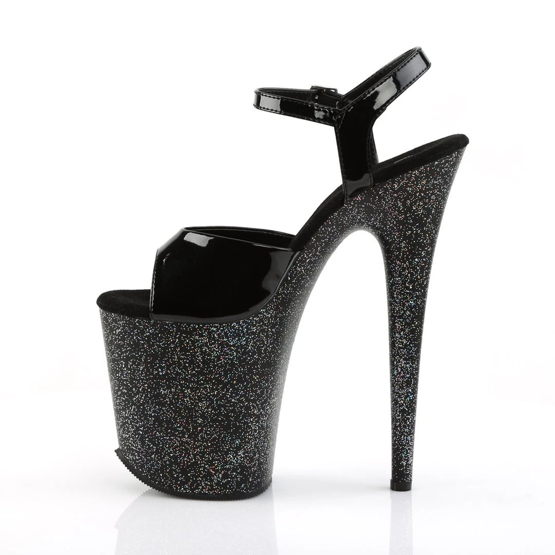 An architectural platform and peep-toe opening create an unforgettable silhouette. This Ankle Strap Sandal Featuring Mini Iridescent Glitters on Entire Platform Bottom with single toe strap with wider sides and thin middle, ankle strap with side closure and two supporting straps on sides. The soft cushioning contributes, alongside the 4 inch front platform, to creating a comfortable feel for the feet, while the 8 inch high heels add that provocative touch for a sexy look without any sacrifice.