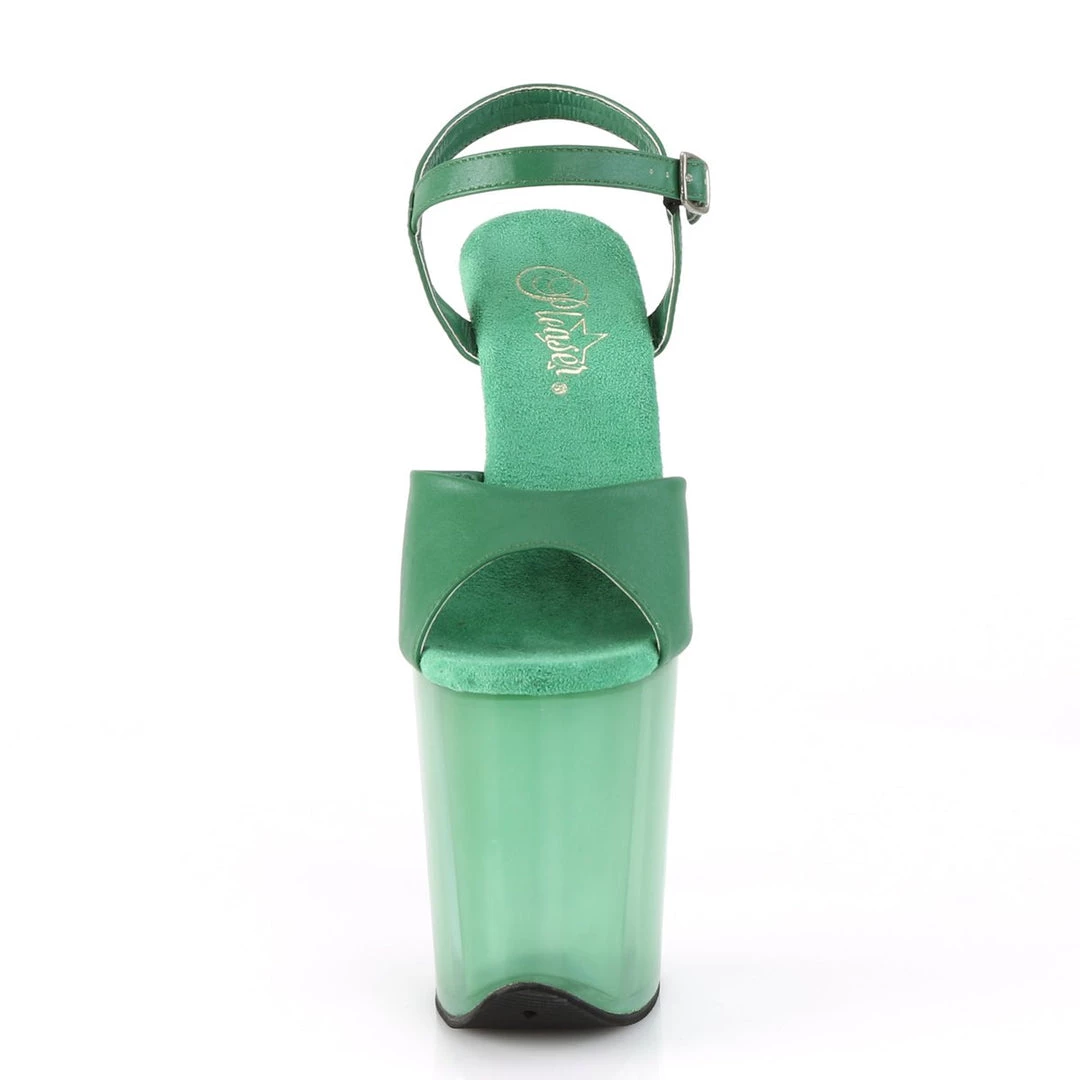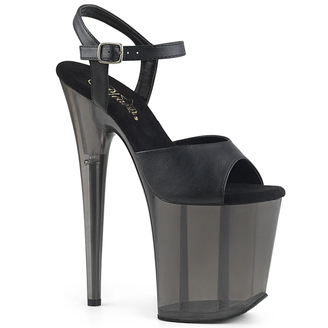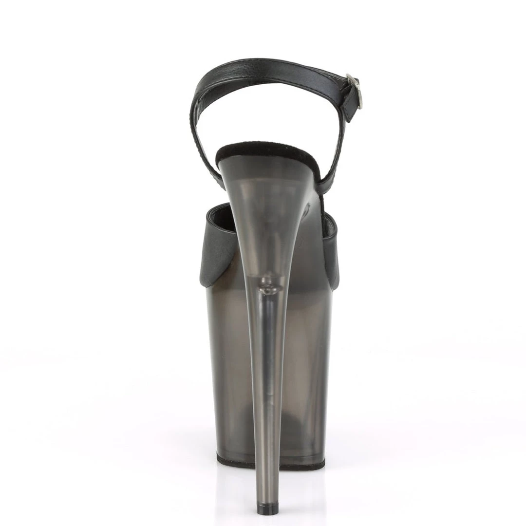 Sleek and sexy 8″ (200mm) heel, 4″ (100mm) frosted platform ankle strap sandal.