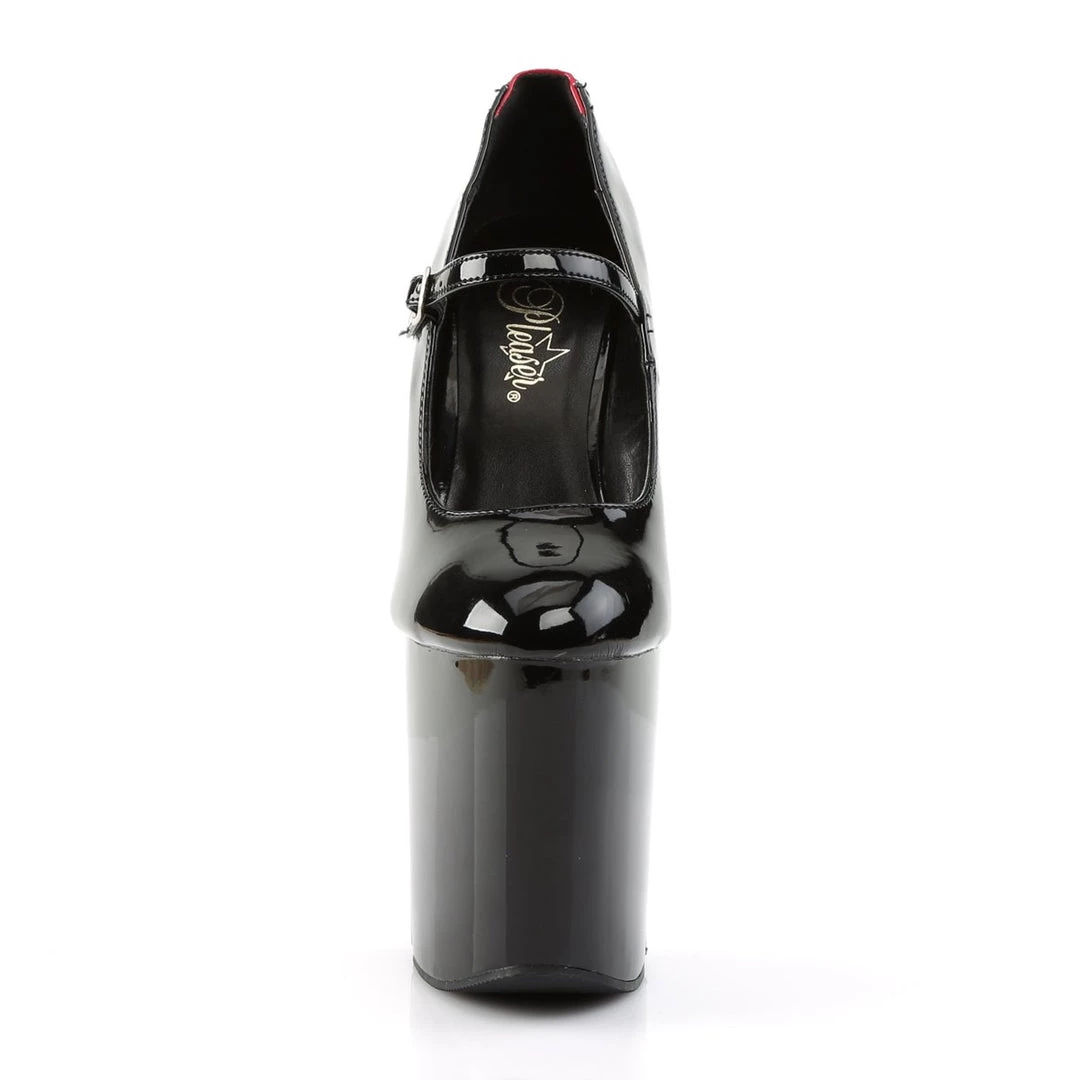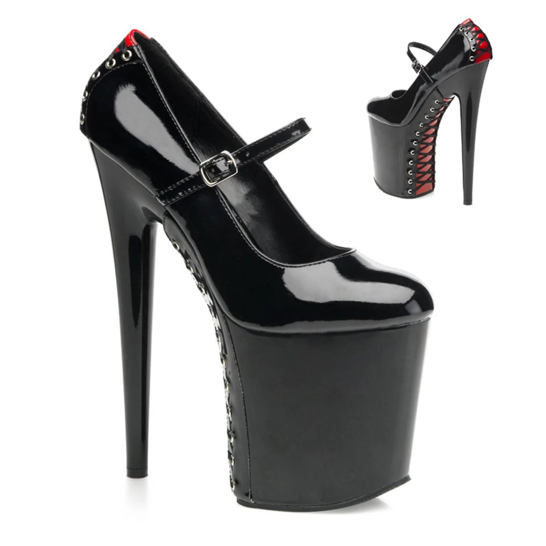 This Mary Jane features an adjustable strap, corset detail. The look is completed by the 8 inch high heels complemented by the 4 inch front platform.