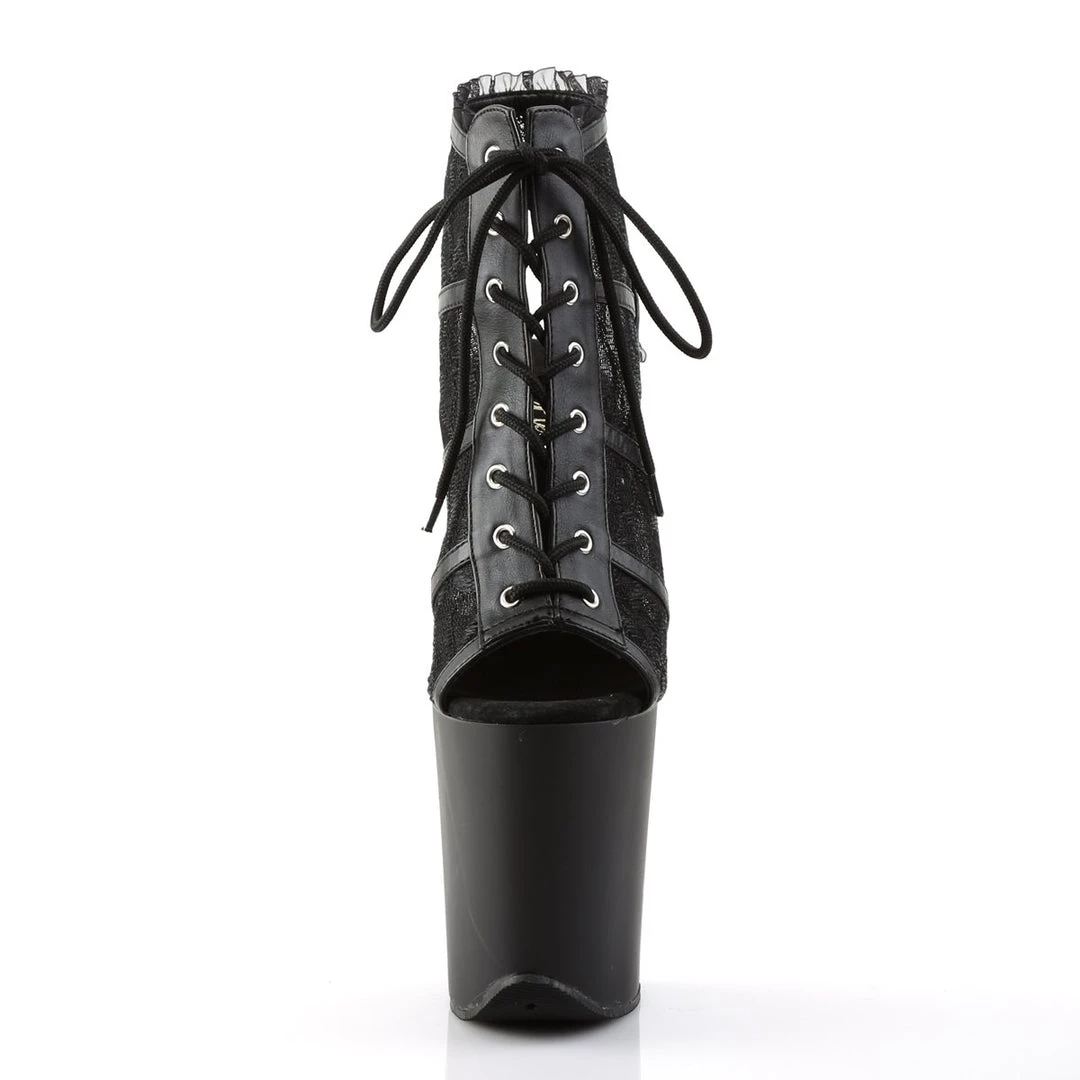 Platform Open Toe/Heel Lace-Up Front Ankle Boot w/Lace Trim Detail, Inside Zip Closure. The soft cushioning contributes, alongside the 4 inch front platform, to creating a comfortable feel for the feet, while the 8 inch high heels add that provocative touch for a sexy look without any sacrifice.