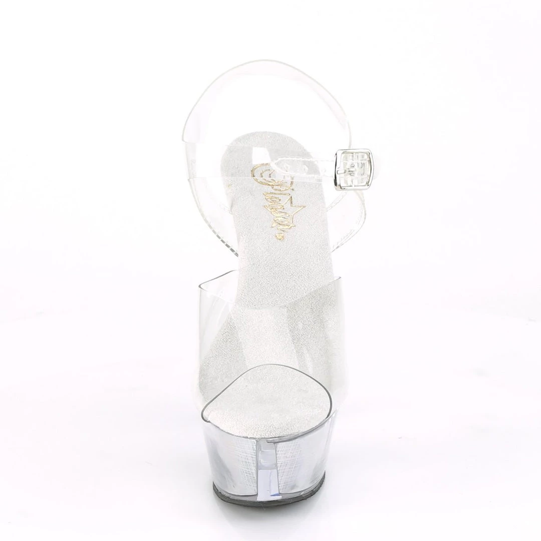 Beautiful 6″ (152mm) heel, 1 3/4″ (45mm) platform USB chargeable LED light-up ankle strap sandal with multiple static/ changing color options & light settings and crosshatch hologram inserts in the platform bottom.