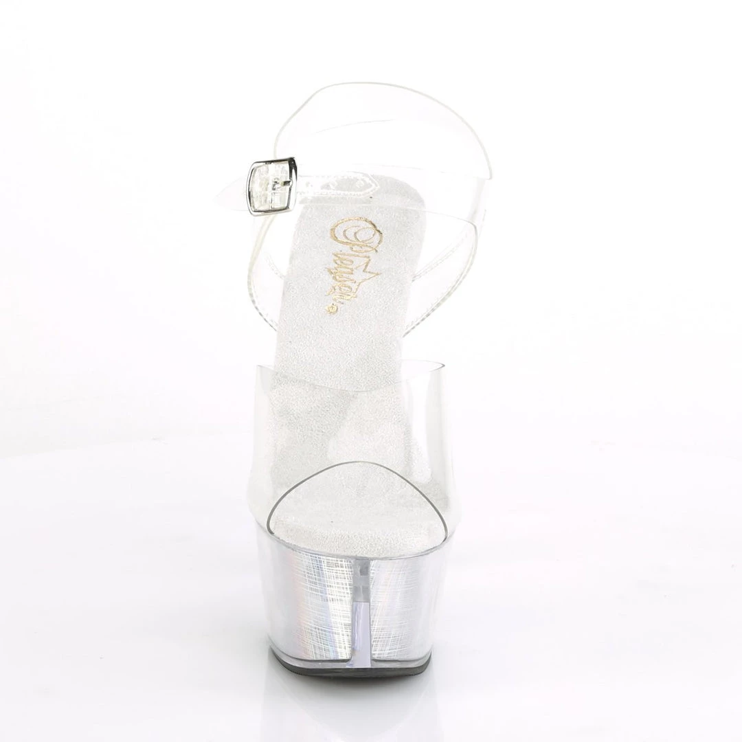 Beautiful 6″ (152mm) heel, 2 1/4″ (57mm) platform USB chargeable LED light-up ankle strap sandal with multiple static/changing color options & light settings and crosshatch hologram inserts in the platform bottom.