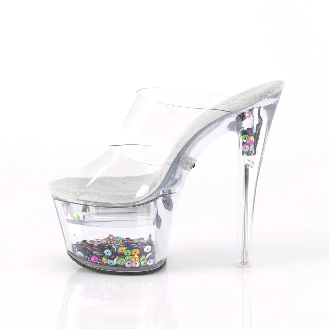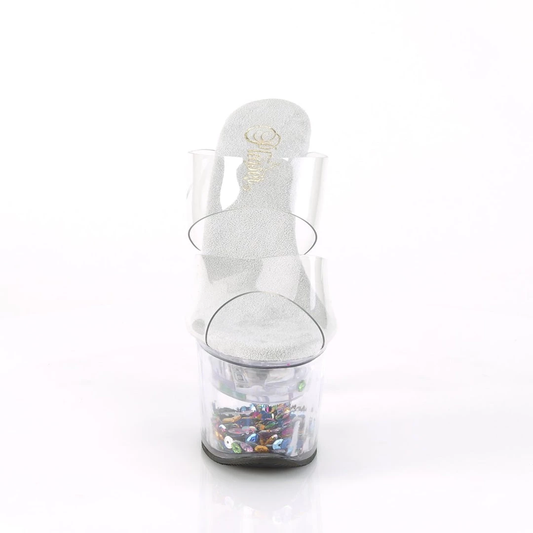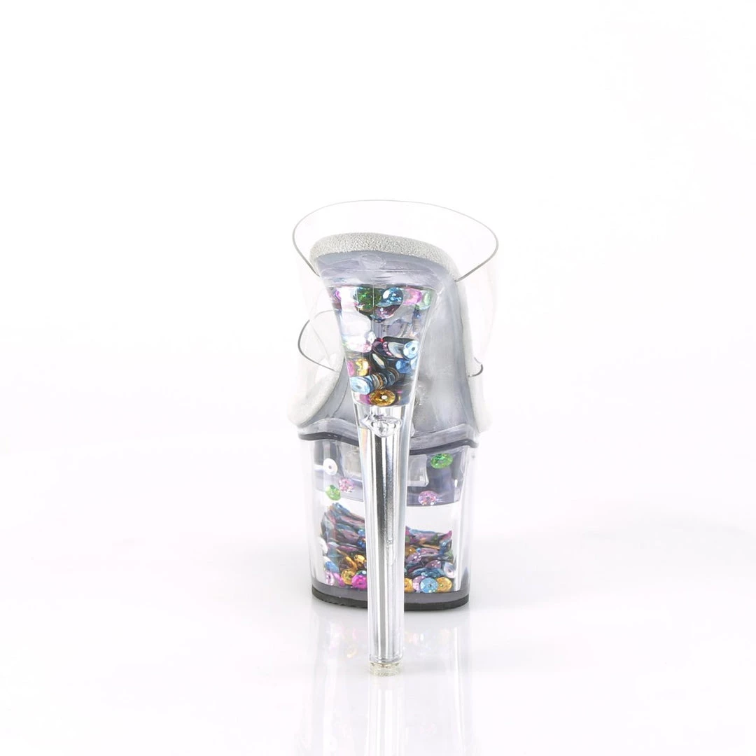 Get noticed in these stunning 7″ (178mm) heel, 2 3/4″ (70mm) platform USB chargeable LED light-up two band slides with multiple static/ changing color options & light settings and reflective multi-color cup sequins in the platform bottom.