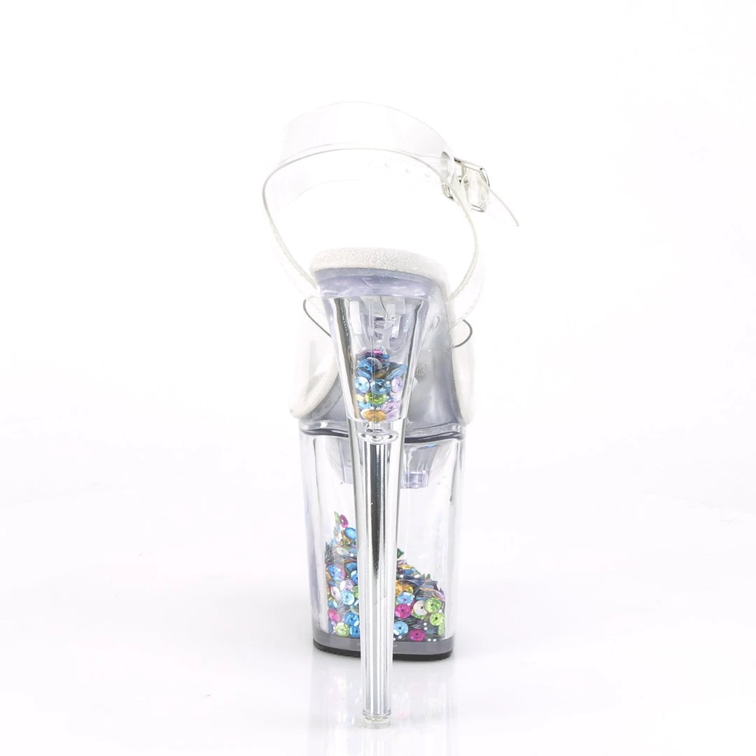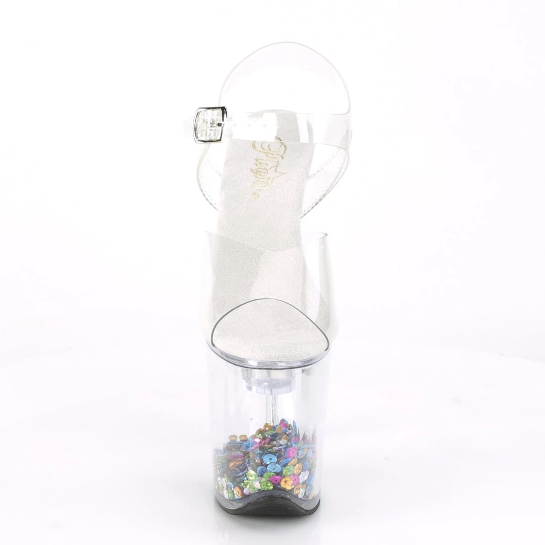 Light up the night! Gorgeous 8″ (200mm) heel, 4″ (100mm) platform USB chargeable LED light-up ankle strap sandal with multiple static/ changing color options & light settings and reflective multi-color cup sequins in the platform bottom.