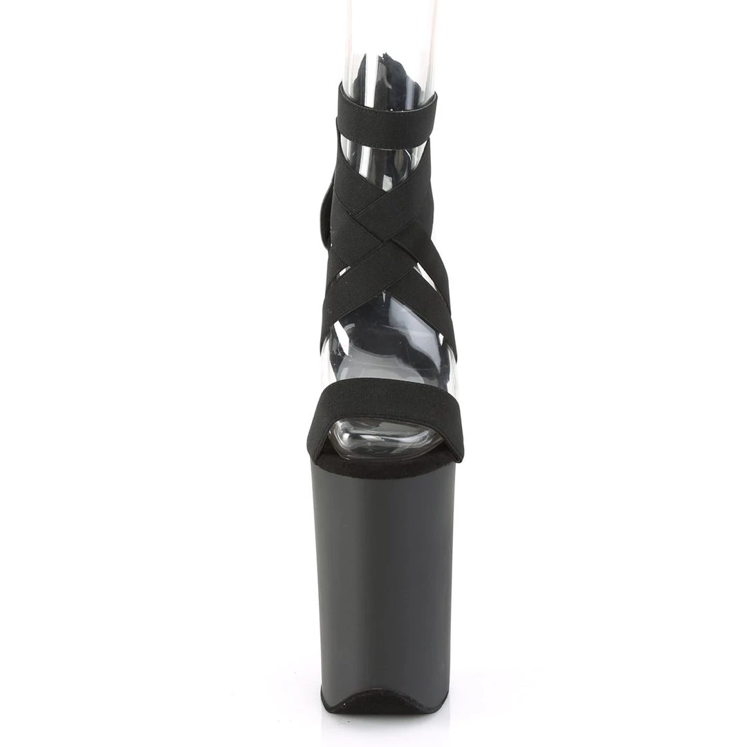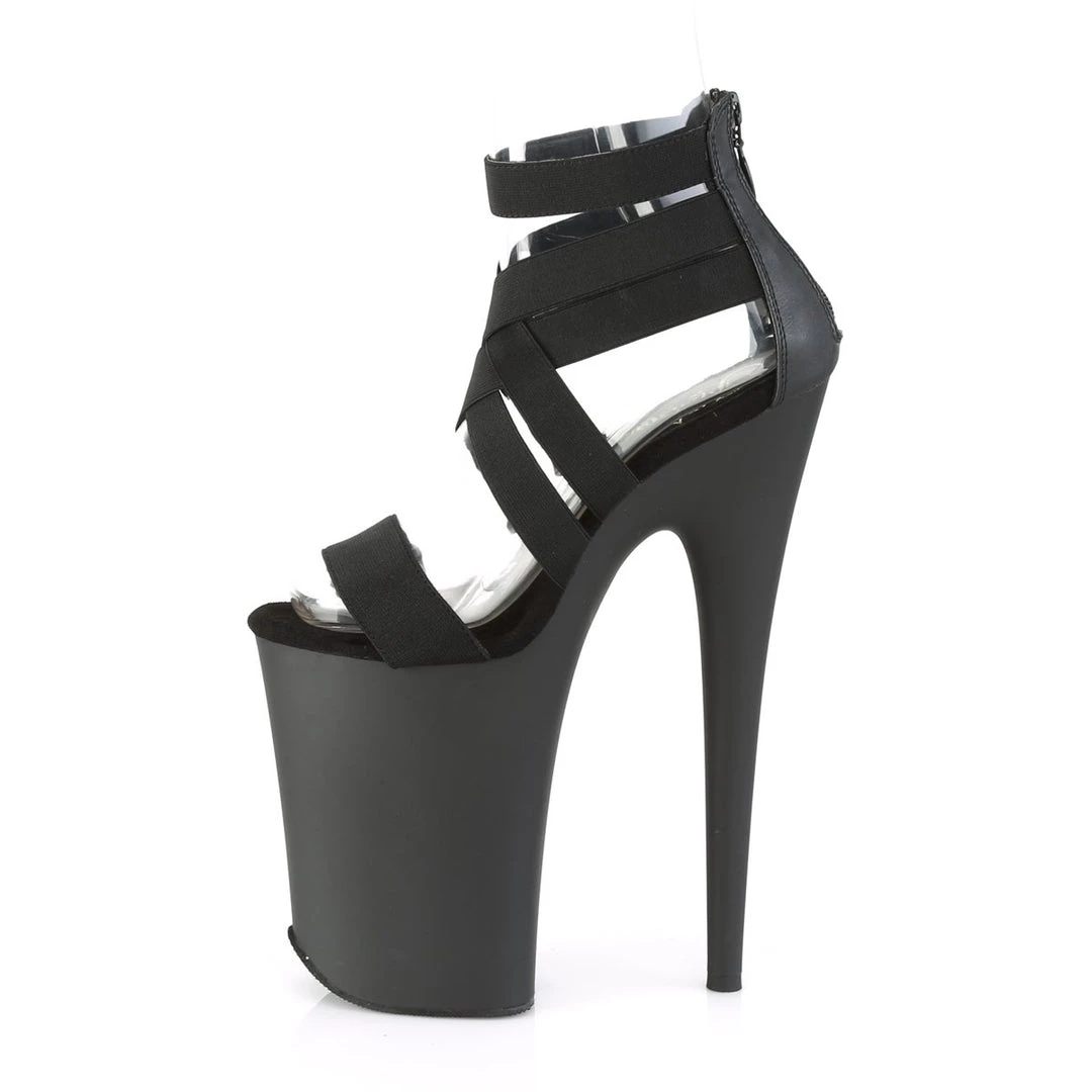 Sexy 9″ (230mm) heel, 5 1/4″ (135mm) platform criss cross closed back sandal, back zip closure.