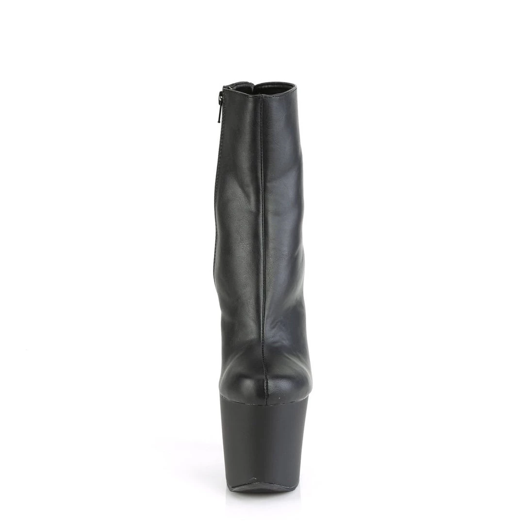 Sleek & powerful style! 7″ (178mm) heel, 3 1/4″ (83mm) platform ankle boot featuring chrome plated brass knuckles heel and inside zip closure.