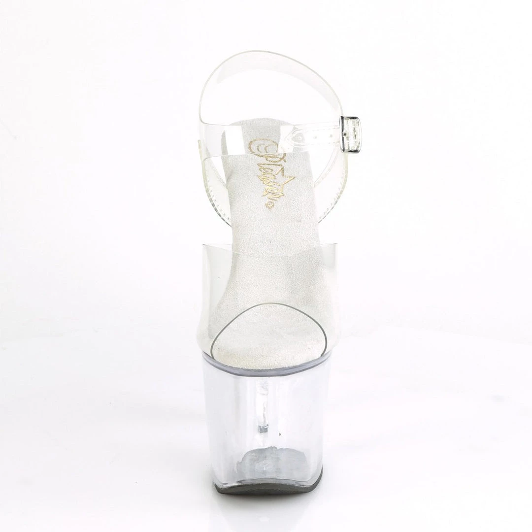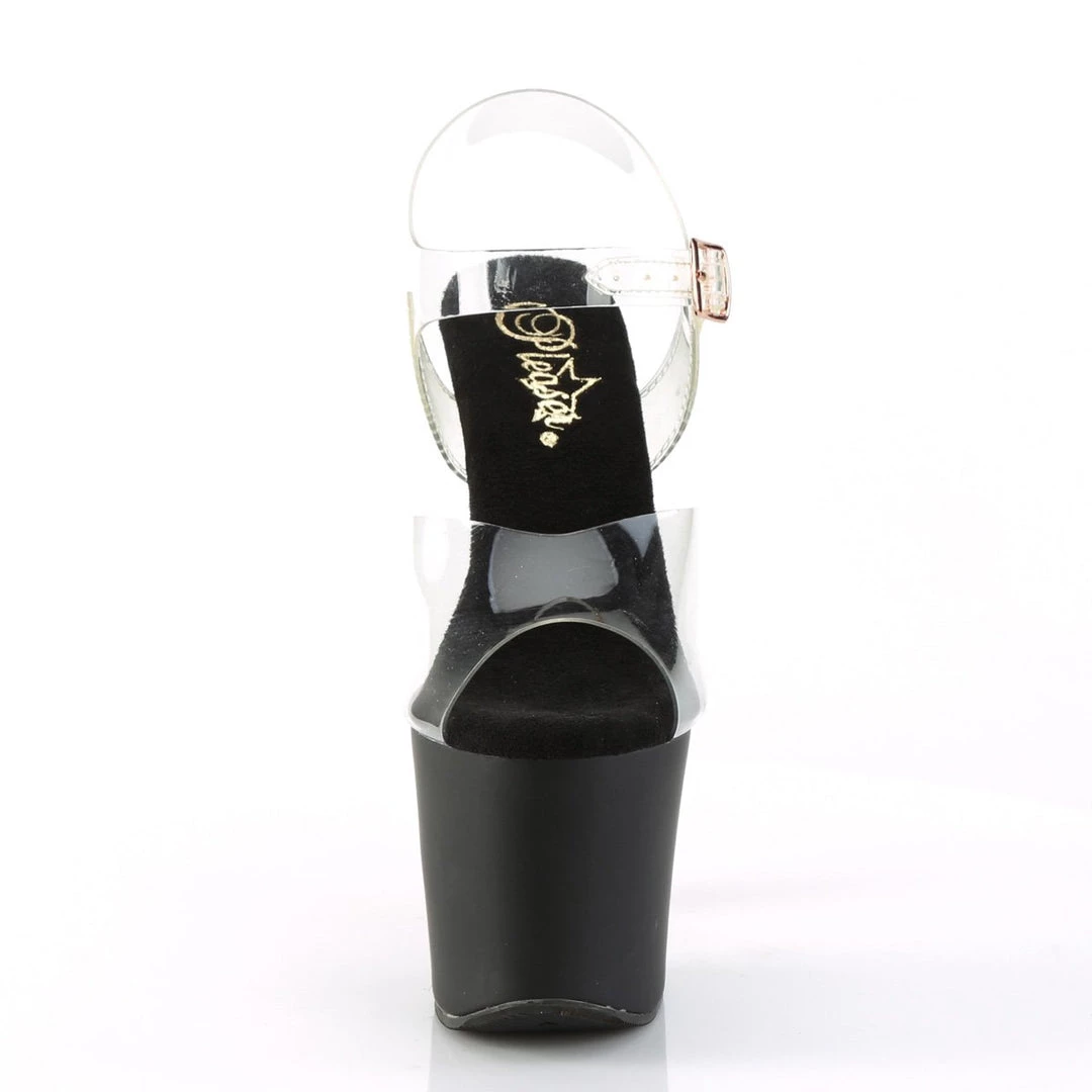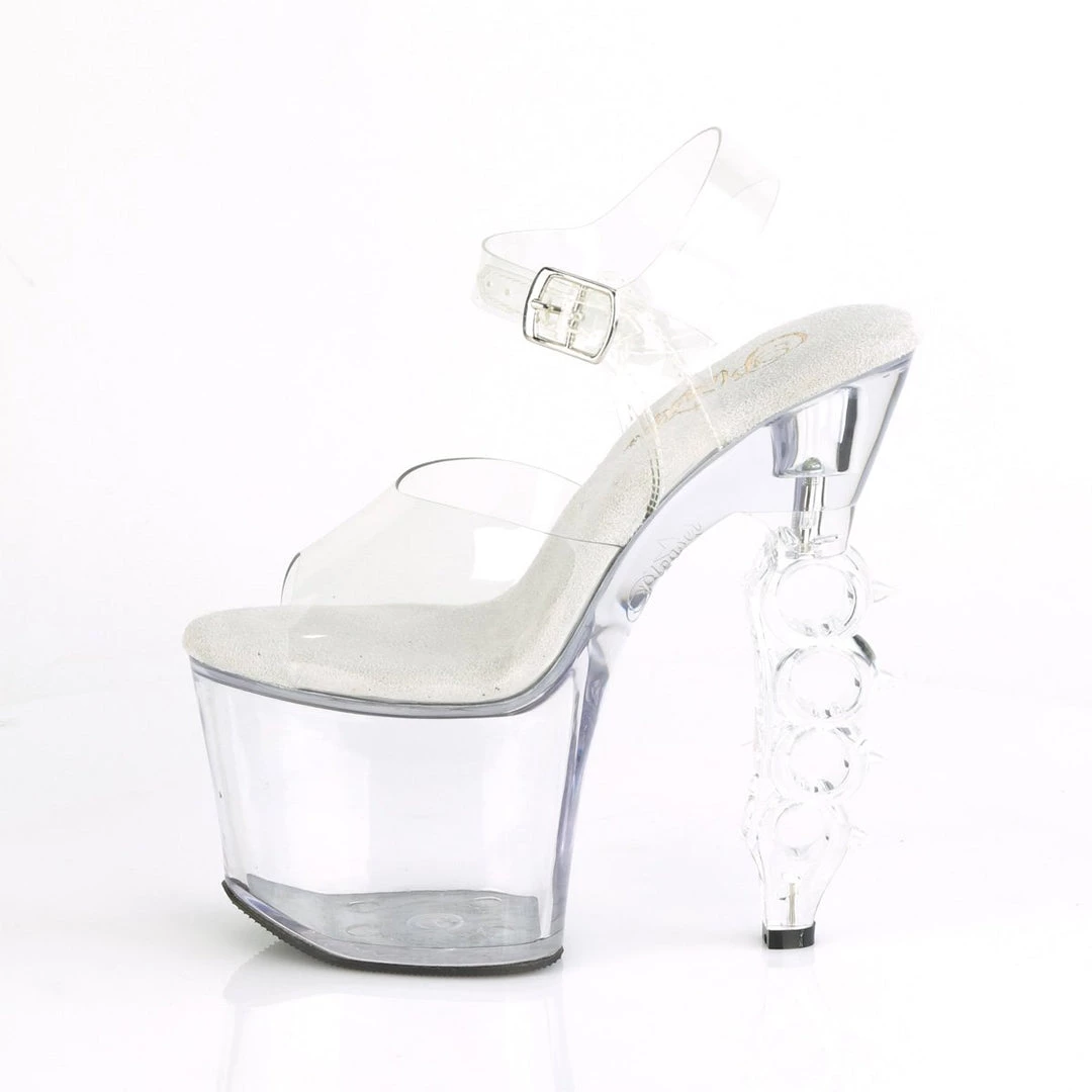 Bold 7″ (178mm) heel, 3 1/4″ (83mm) platform ankle strap sandal featuring brass knuckles heel.