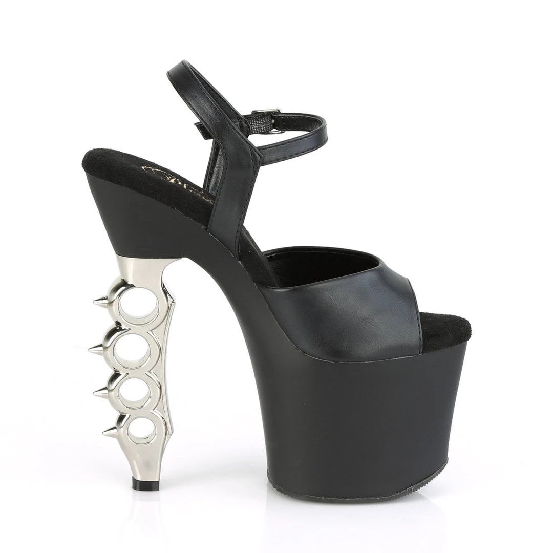 Be a lil’ badass! Sleek and dangerous! 7″ (178mm) heel, 3 1/4″ (83mm) platform ankle strap sandal featuring chrome plated brass knuckles heel.