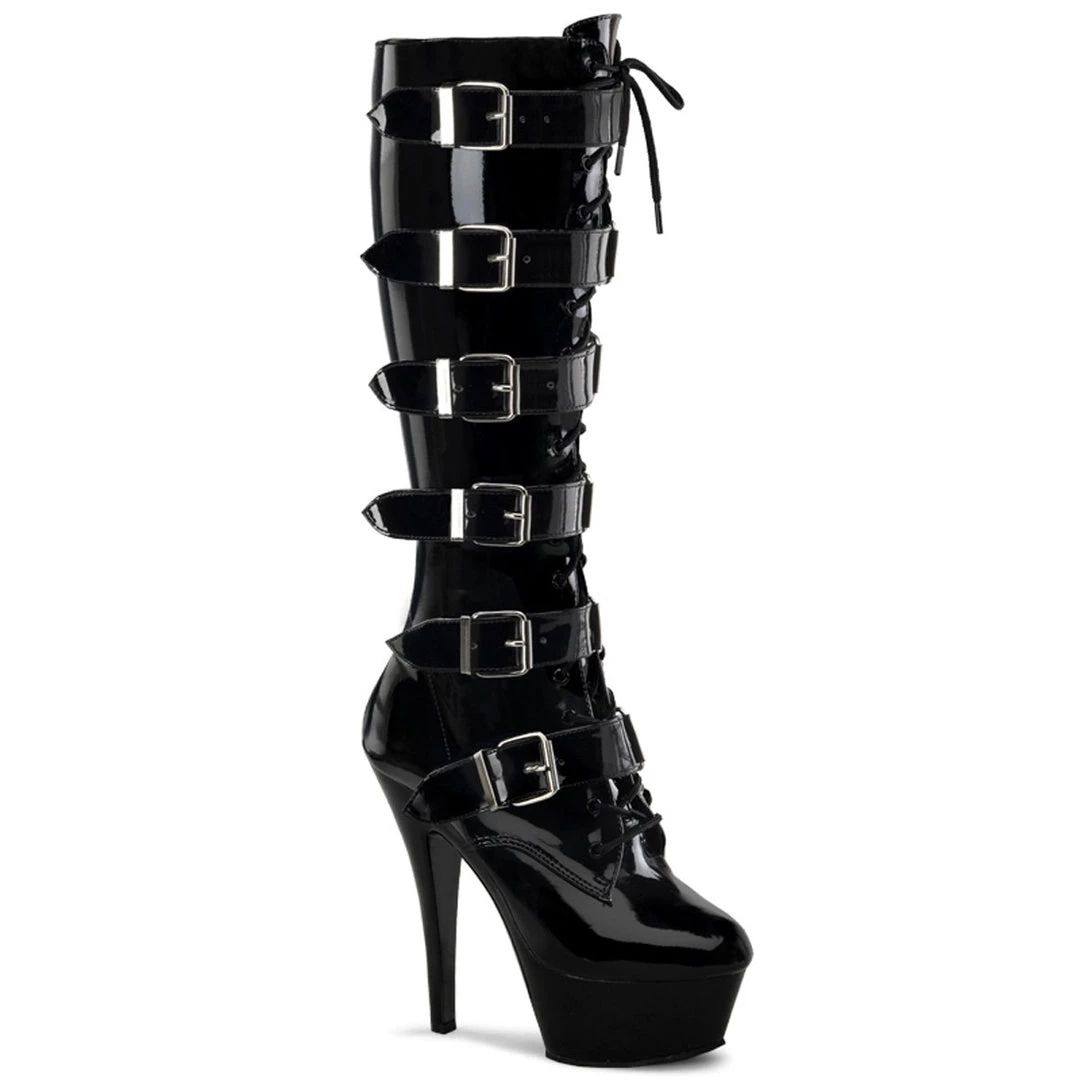 Super hot knee-high boots crafted in glossy black patent, front lace-up closure with tone-to-tone laces, side zip closure and 6 inch (15 cm) high stiletto heels. The top is decorated with horizontal straps with metallic buckle fastening on sides, while the front platform adds balance and stability for an effortless wear.