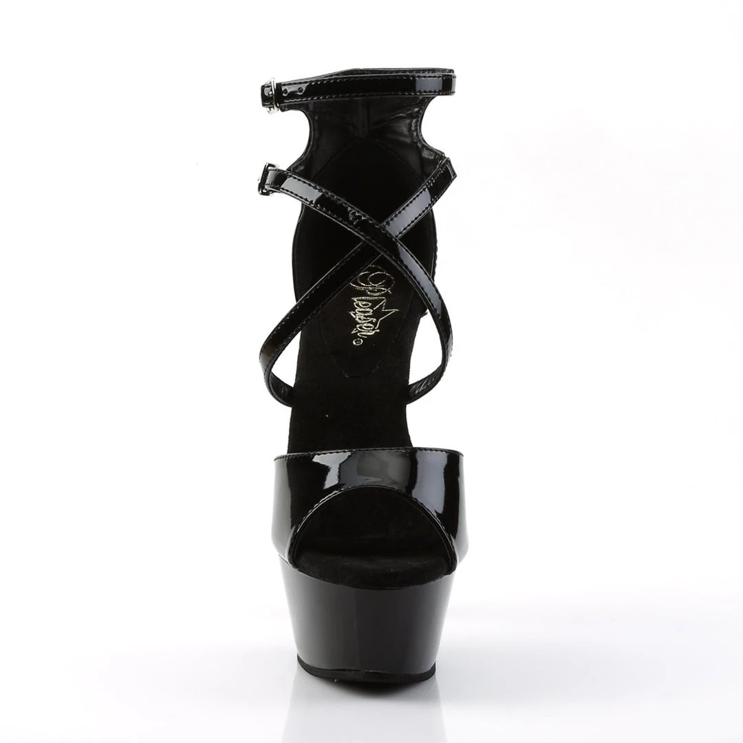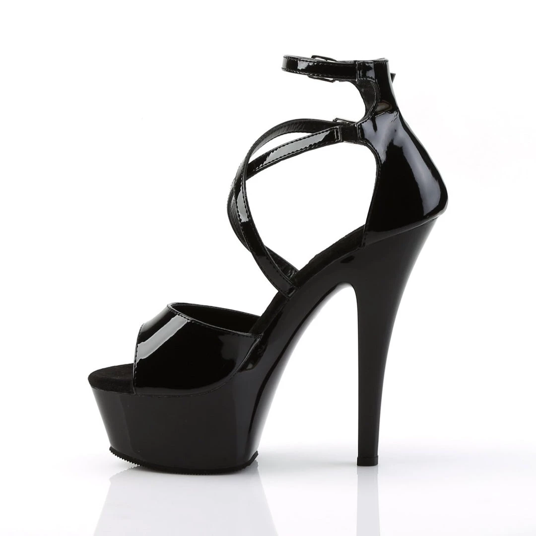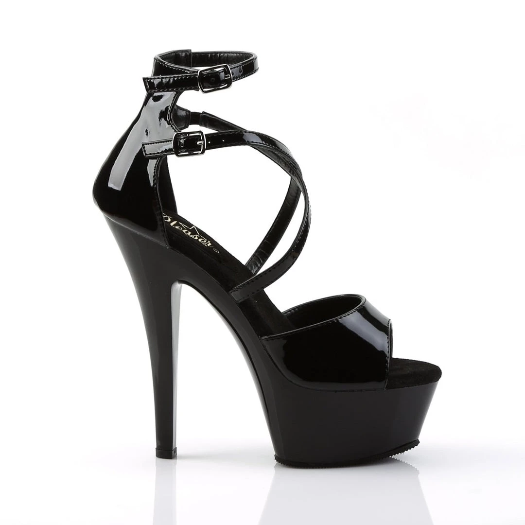 Be daring in this sexy Kiss sandal from Pleaser. The glossy upper features criss-crossing straps and a buckle around the ankle for added support. It also features an ultra-high platform that puts this shoe over the top.