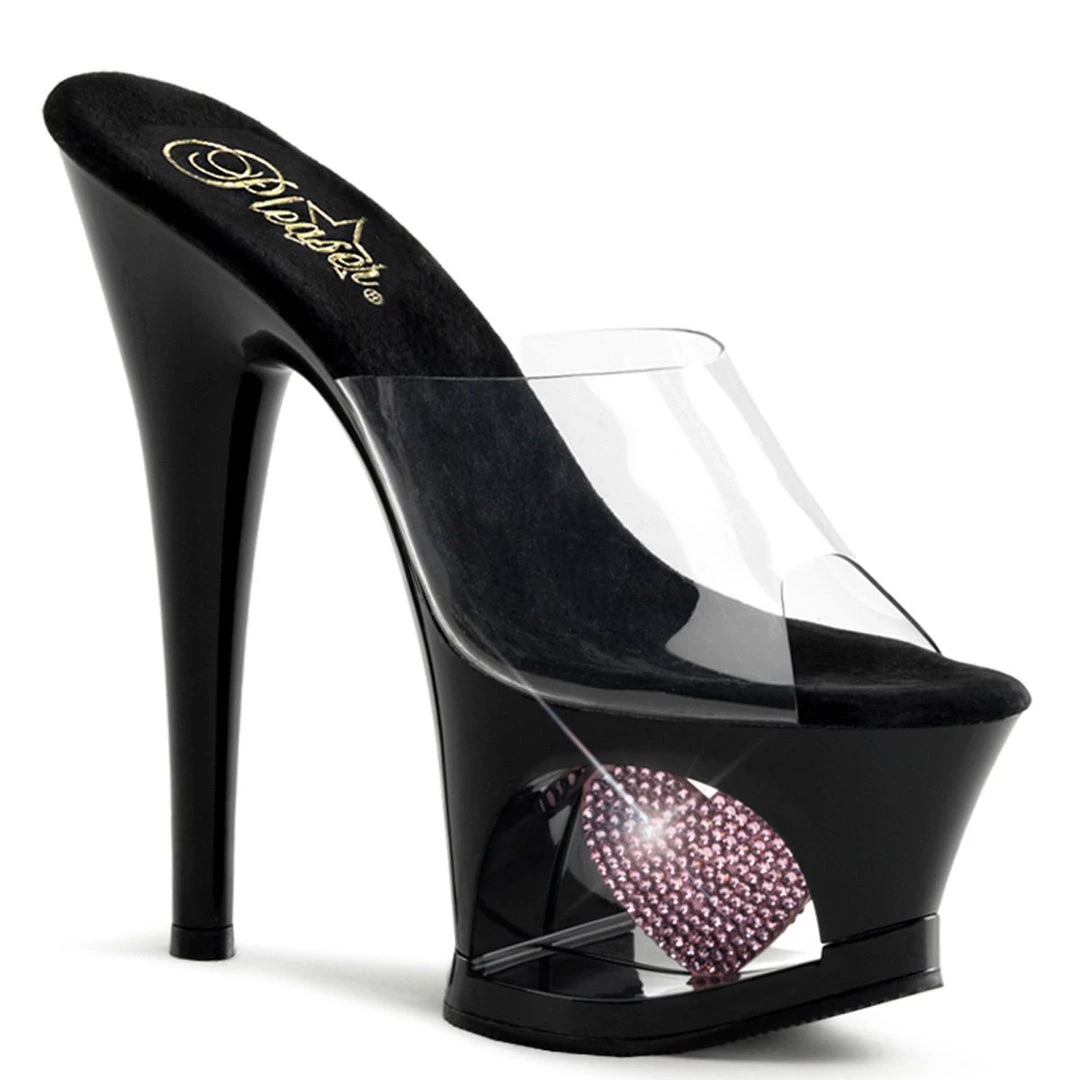 Cut-out Platform Slide Featuring Rhinestone Covered Heart In The Platform, these celestial inspired sandals feature a clear top with open toe, while the high stiletto heel boosts 7 inch in height, balanced by a 2.75 inch front platform. The soft cushioning adds up to the overall look and grants a comfortable wear over and over again and also for added style and a soft feel.