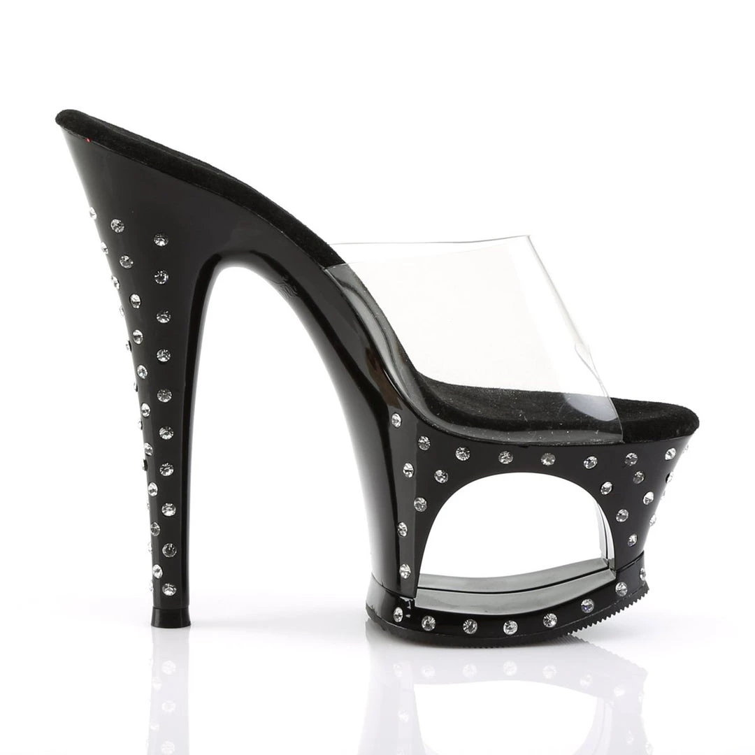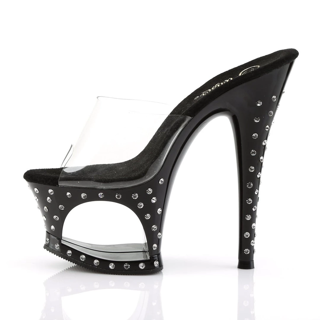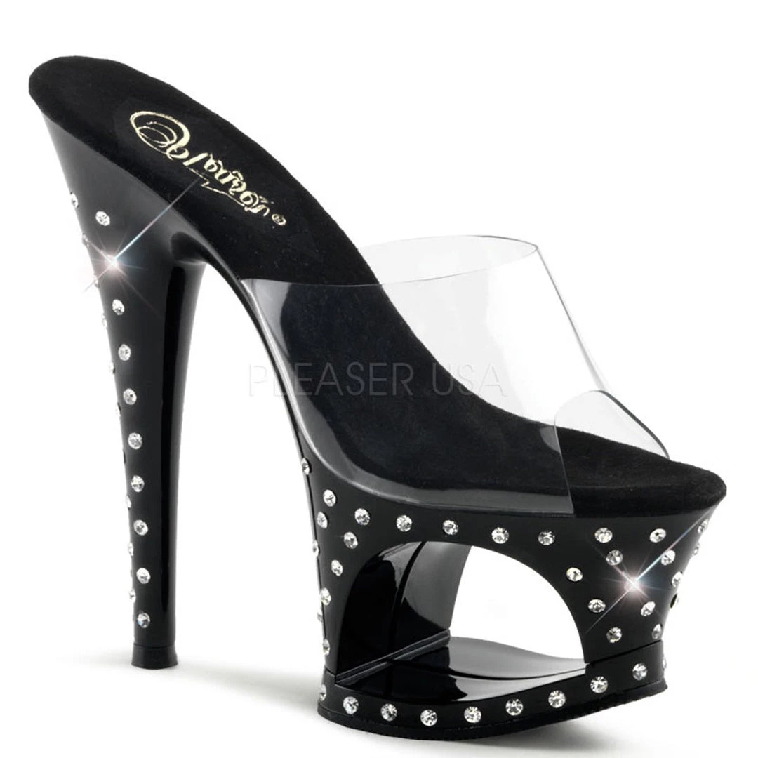 These celestial inspired sandals feature a cutout platform bottom, Rhinestones Embedded All Over Platform & Heel and a clear top slide. The clear toe area has wide sides and thin middle, while the high stiletto heel boosts 7 inch in height, balanced by a 2.75 inch front platform. The soft cushioning adds up to the overall look and grants a comfortable wear over and over again and also for added style and a soft feel.