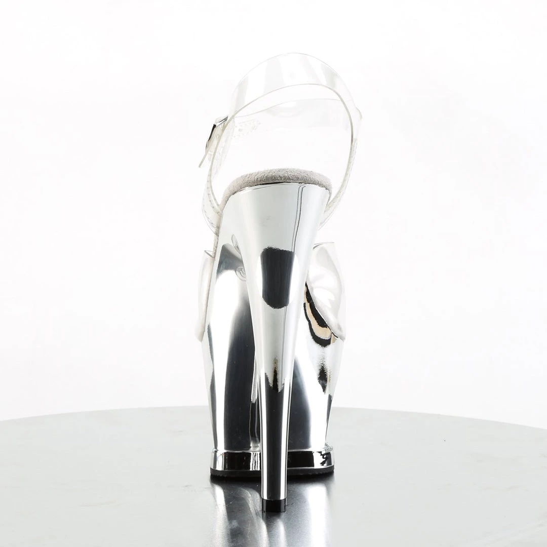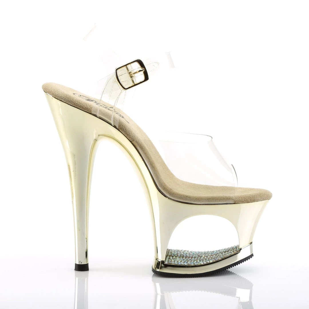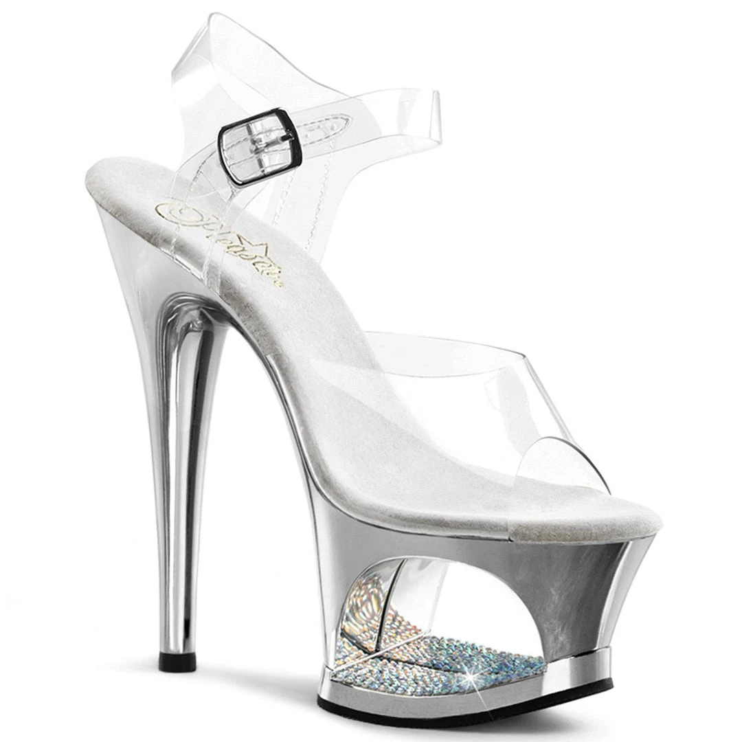 A ankle strap sandals featuring crystals detail in the platform base. 7 inch (17.5 cm) high heels.