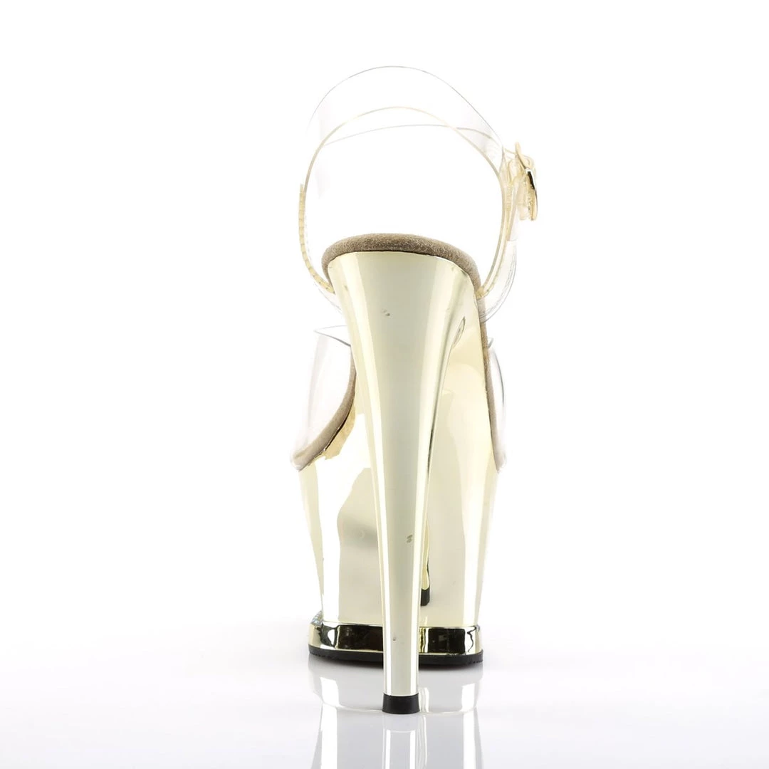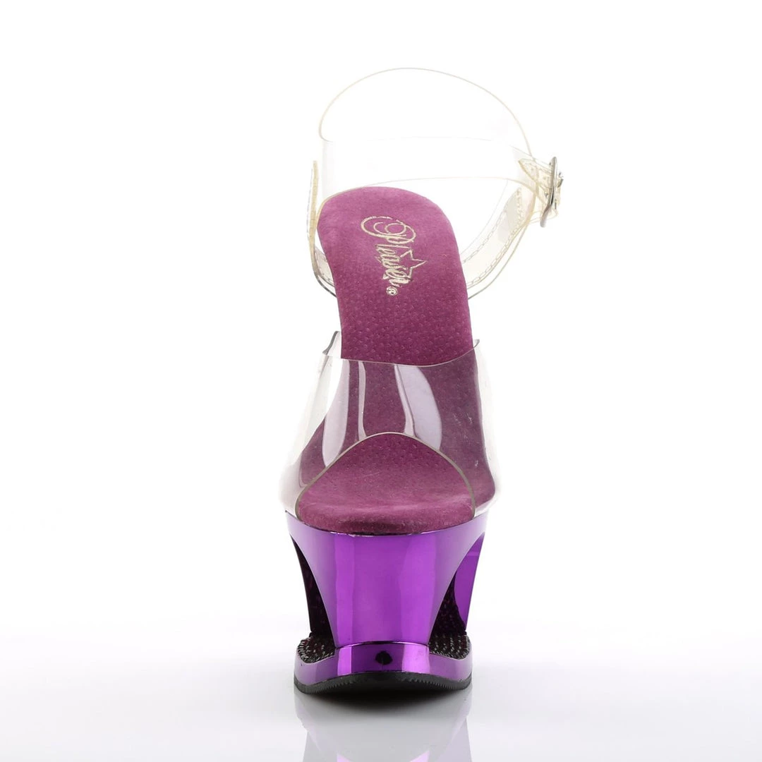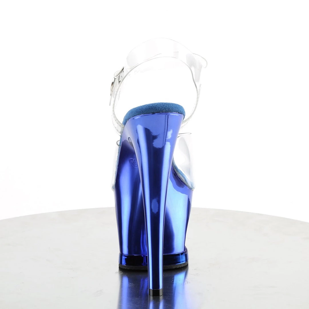 A ankle strap sandals featuring crystals detail in the platform base. 7 inch (17.5 cm) high heels.