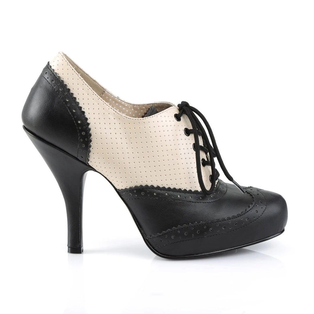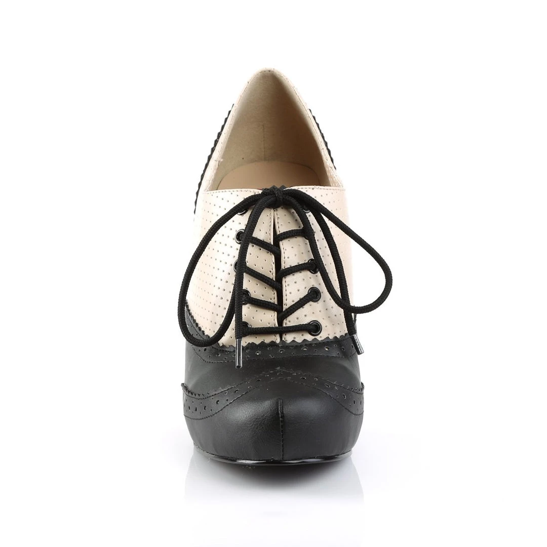 These 4 1/2″ (11.4cm) heel, 3/4″ (1.9cm) platform two tone lace up front pump are fun with a touch of retro style.