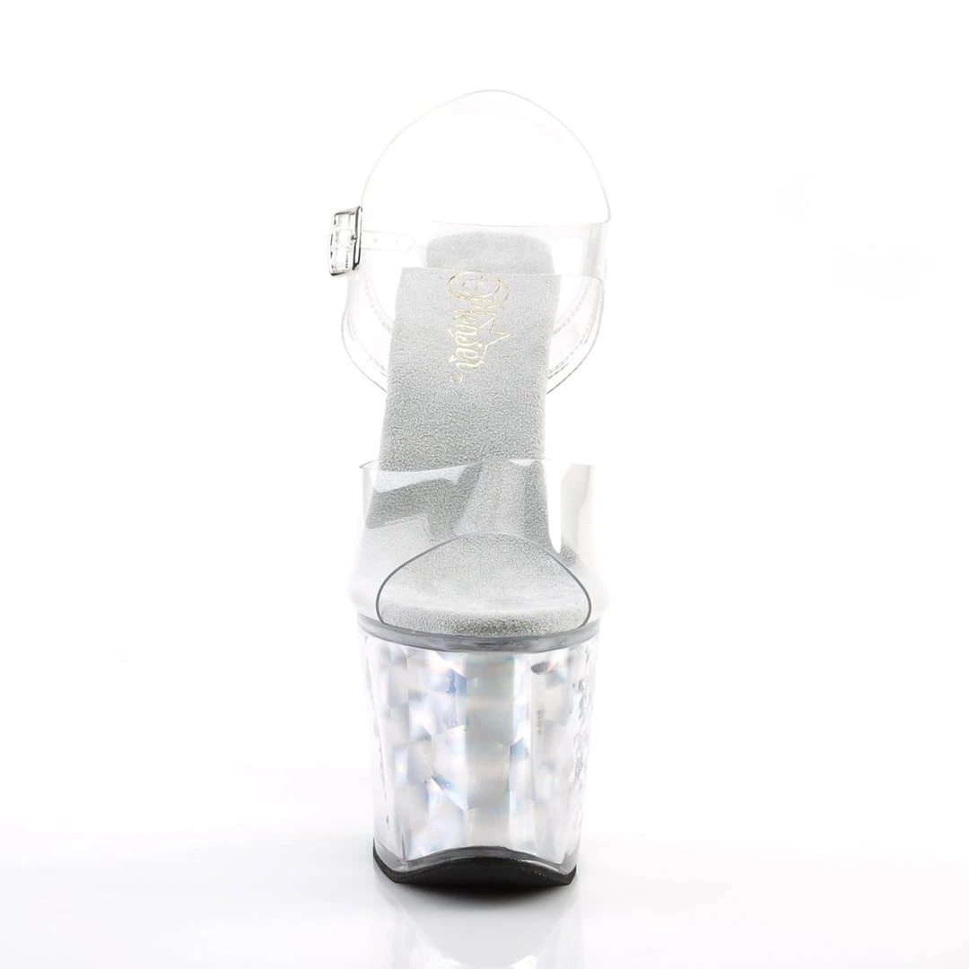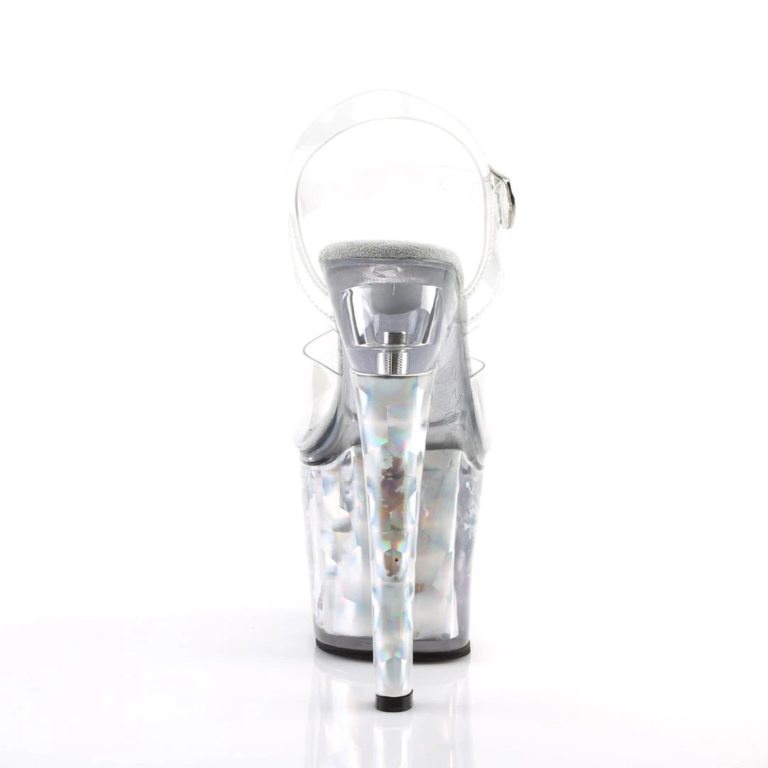 Stunning 7″ (178mm) heel, 3 1/4 (83mm) platform ankle strap sandal featuring hexagon holographic heel & platform bottom. These sandals are sure to get noticed!