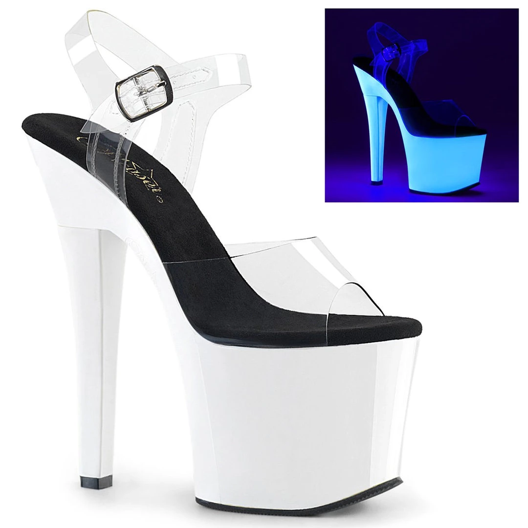 Show off those gorgeous gams with the help of theses stunning 7″ (178mm) heel, 3 1/4 (83mm) platform ankle strap sandals featuring UV blacklight reactive platform bottom.