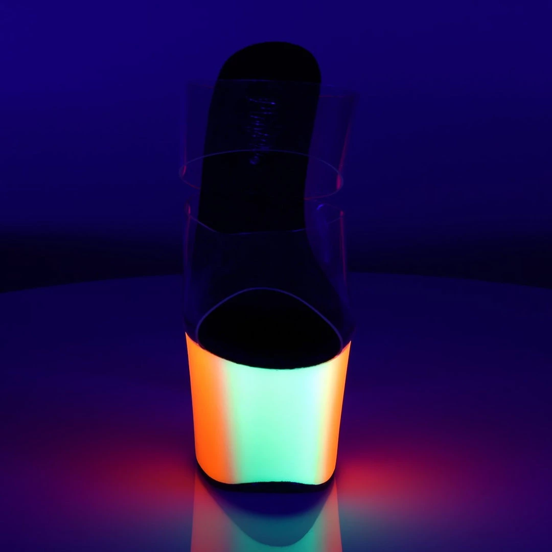 Platform Two-Band Slide Featuring Featuring Neon Blacklight Reactive Multicolored Platform Bottom. Clear wide strap on top, peep-toe and padding on the insole for a soft feel and a good grip. The look is complemented by a 7 inch high stiletto heels and a 2.75 inch front platform.
