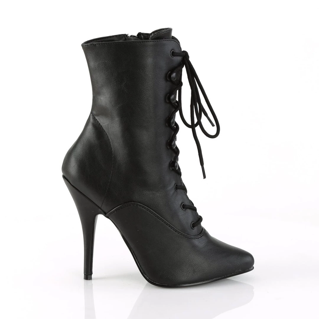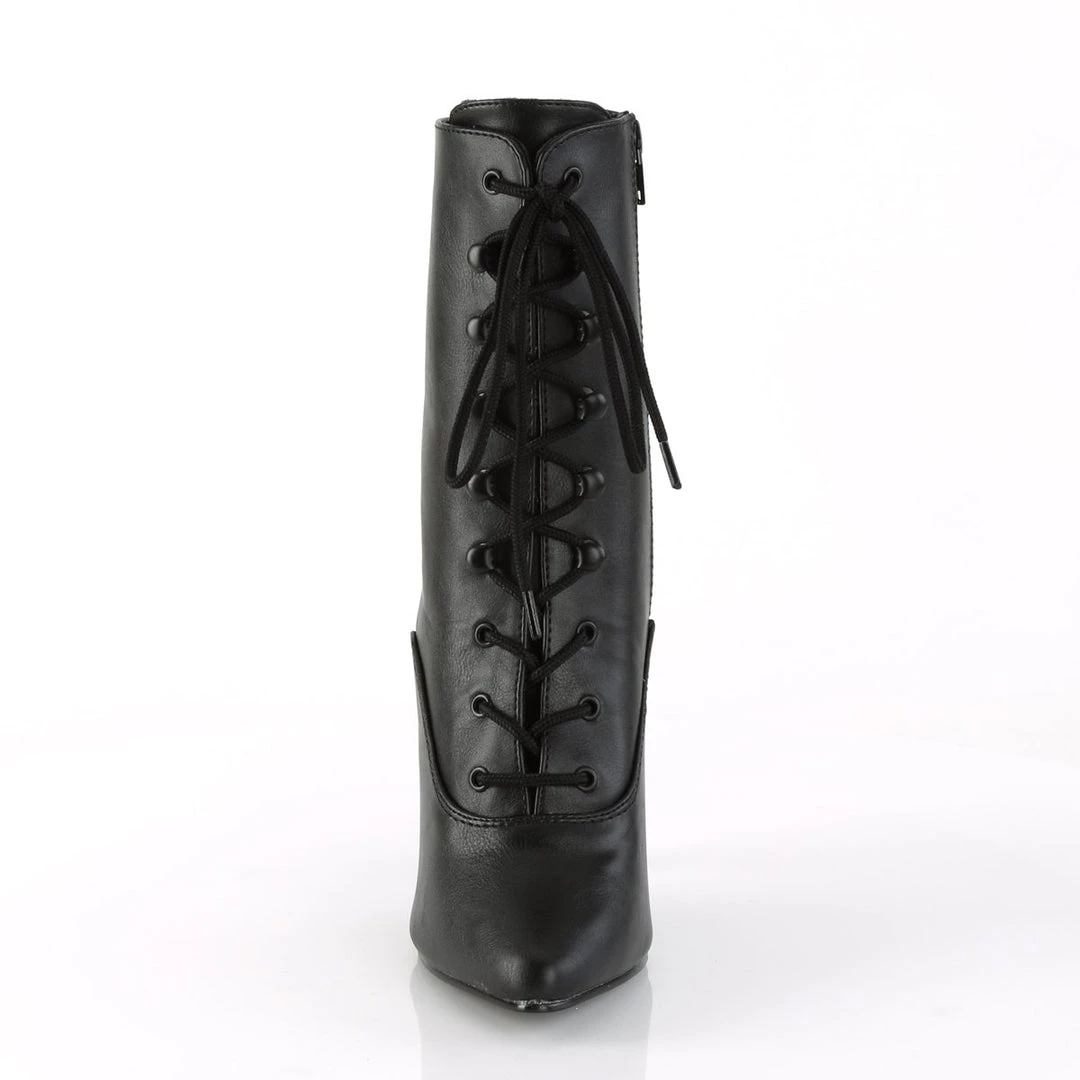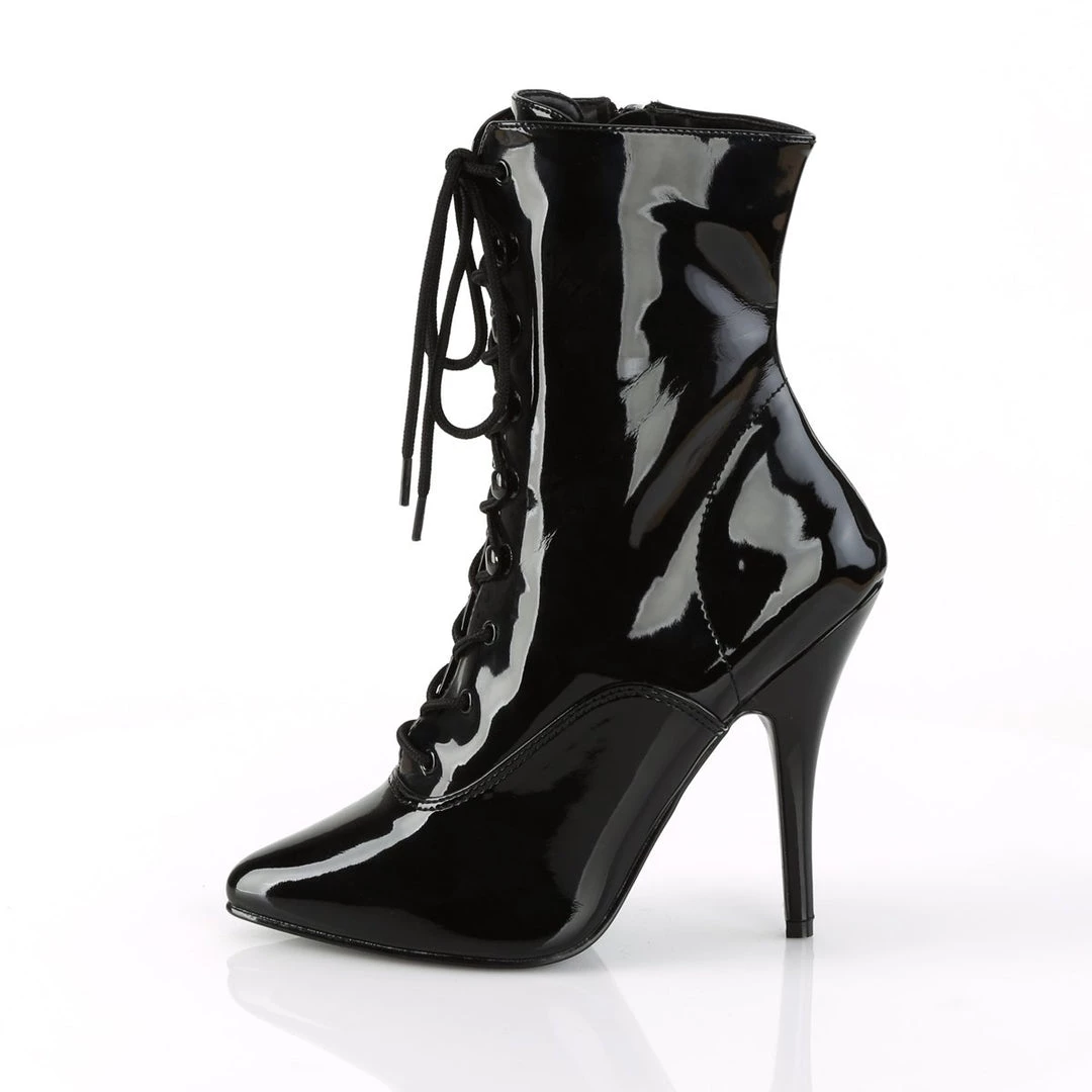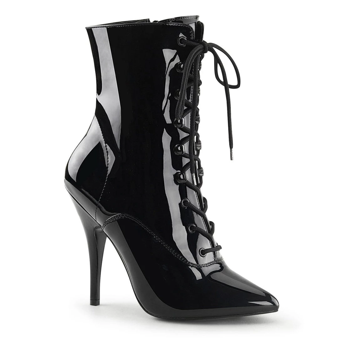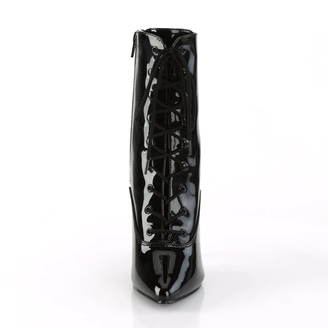 A Ankle-high boots with front tone-to-tone lace up for a perfect fit, size zip closure for a fast put on and pointy toe which gives the foot a slender look. The front flat sole is contrasted by the super high 5 inch (12.5 cm) high stiletto heels. The discrete sewing on the instep and in heel area add further personality and complete this classic design.