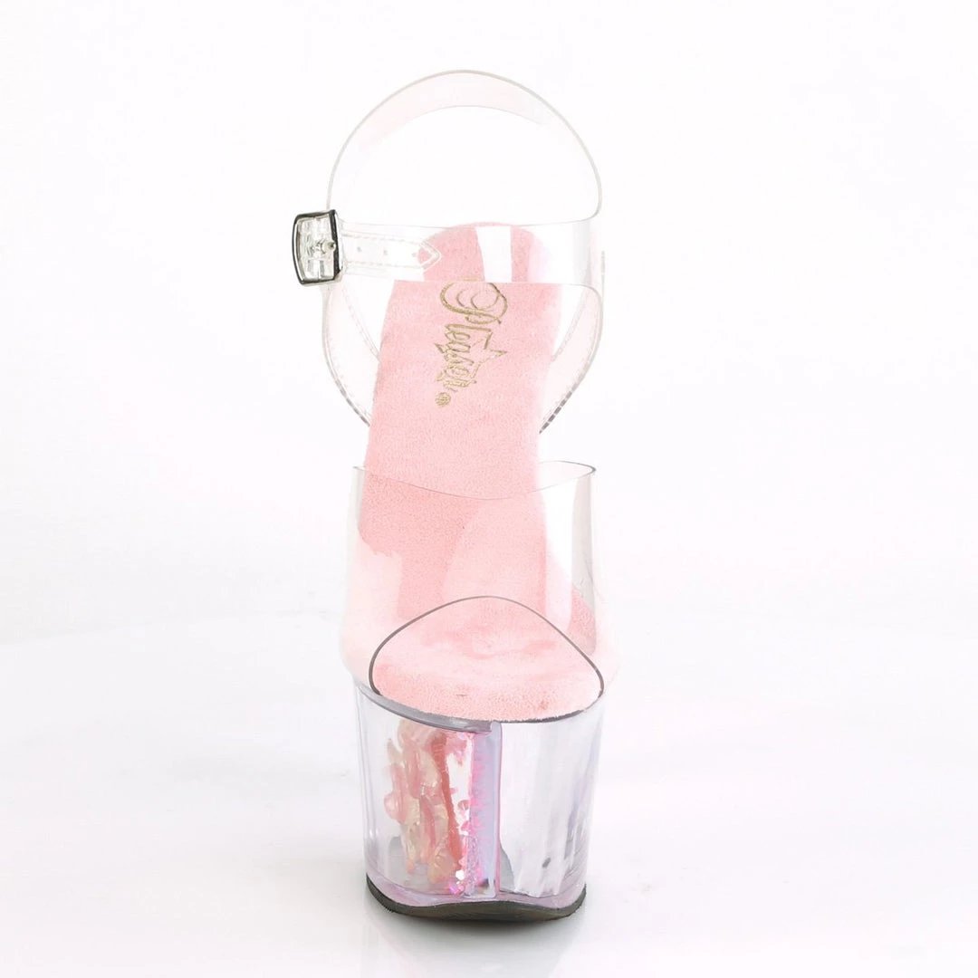Beautiful 7″ (178mm) heel, 2 3/4″ (70mm) platform ankle strap sandal featuring ornamental crystal flower & glitters inside the platform bottom.