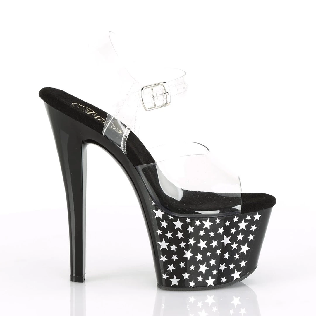 Sparkle the night away in these 7″ (178mm) heel, 2 3/4″ (70mm) platform ankle strap sandals featuring chrome stars on the inner & outer sides of the platform bottom.