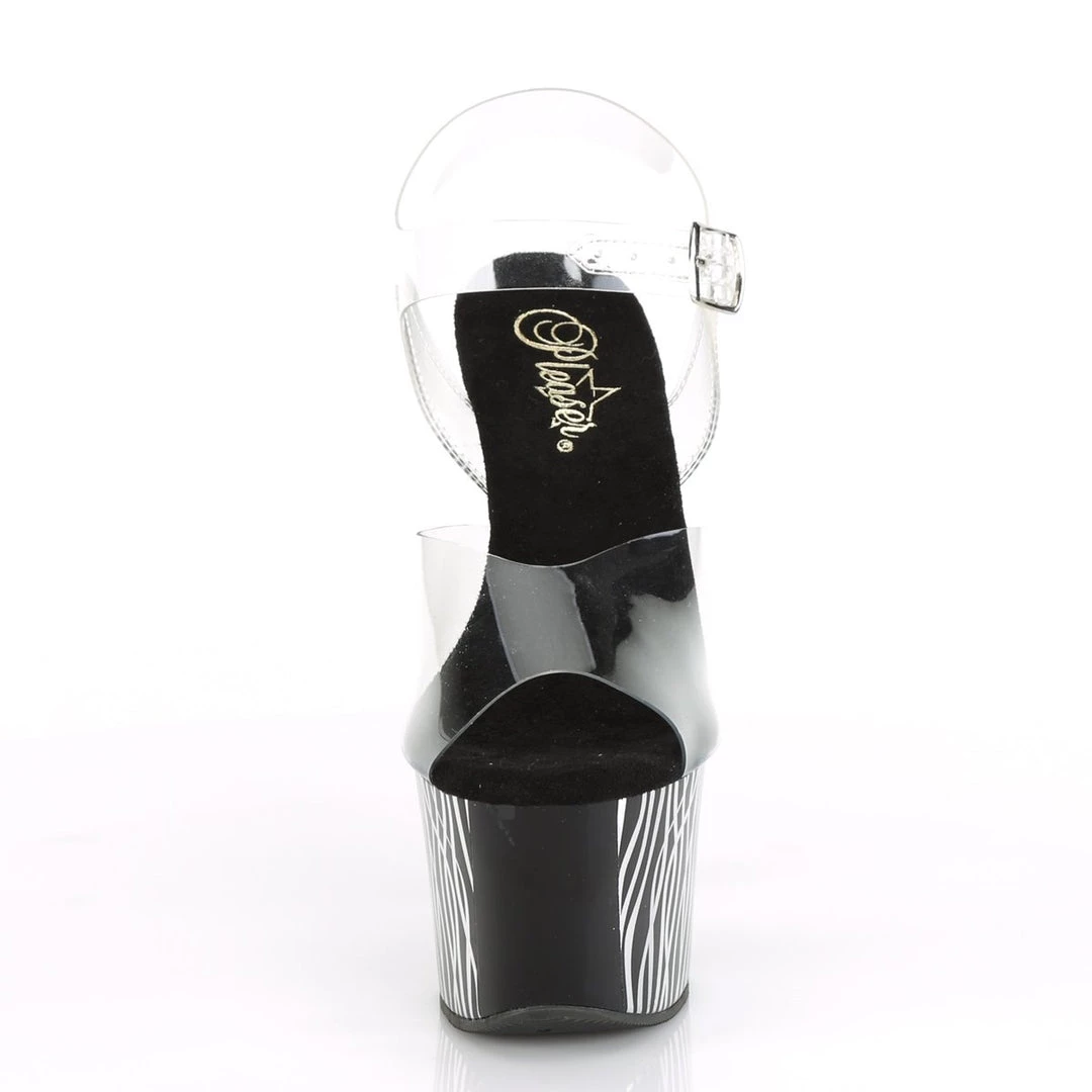 Wildly sexy 7″ (178mm) heel, 2 3/4″ (70mm) platform ankle strap sandal featuring chrome wavy lines on the inner & outer sides of the platform bottom.