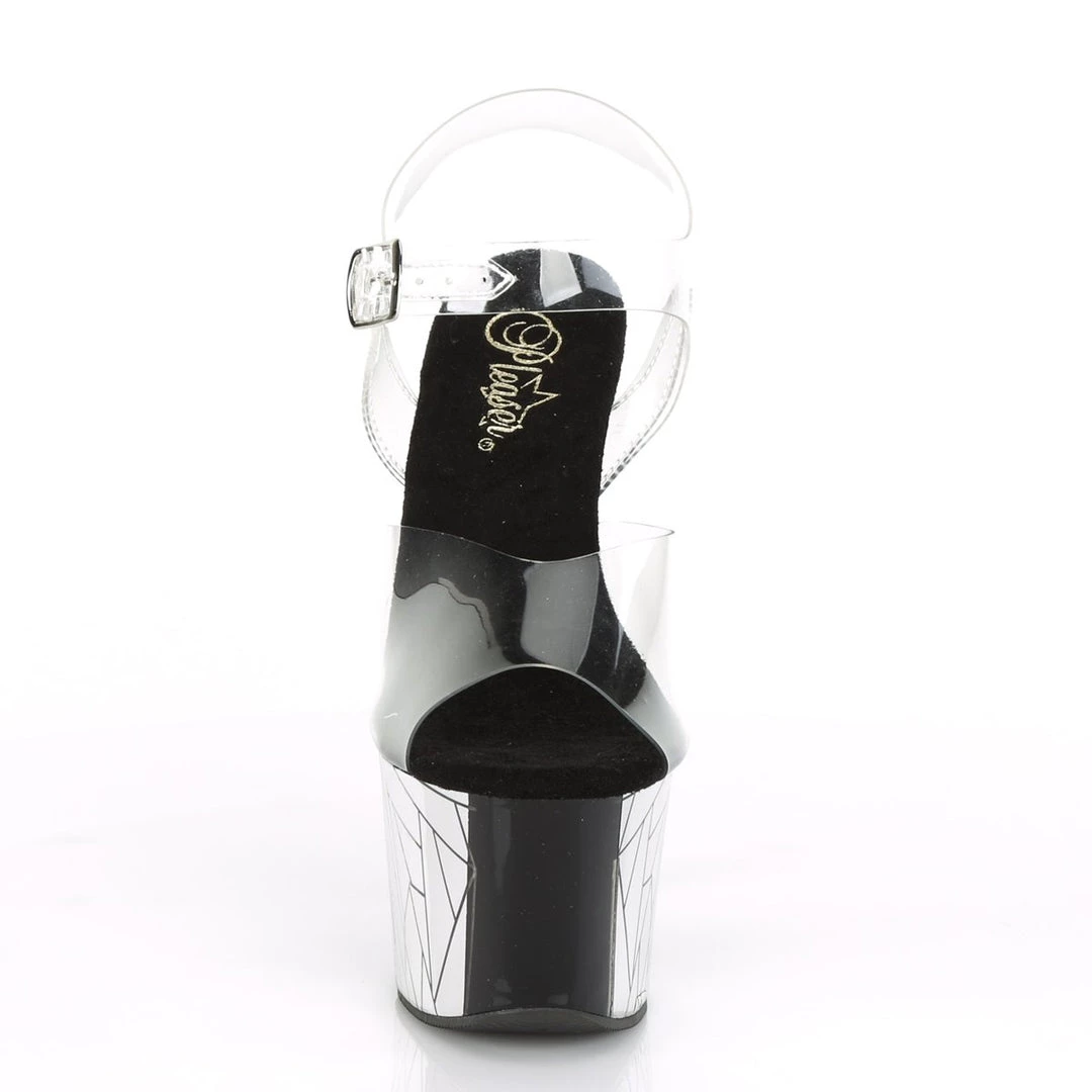 Gorgeous 7″ (178mm) heel, 2 3/4″ (70mm) platform ankle strap sandal featuring chrome shattered glass design on the inner & outer sides of the platform bottom.
