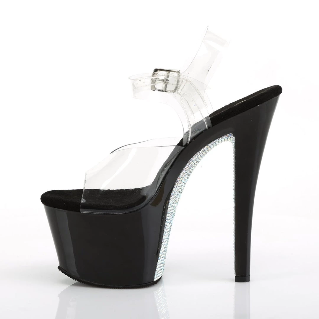 Gorgeous 7″ (178mm) heel, 2 3/4″ (70mm) platform ankle strap sandal. The contrast rhinestones on the platform bottom are sure to catch peoples attention!