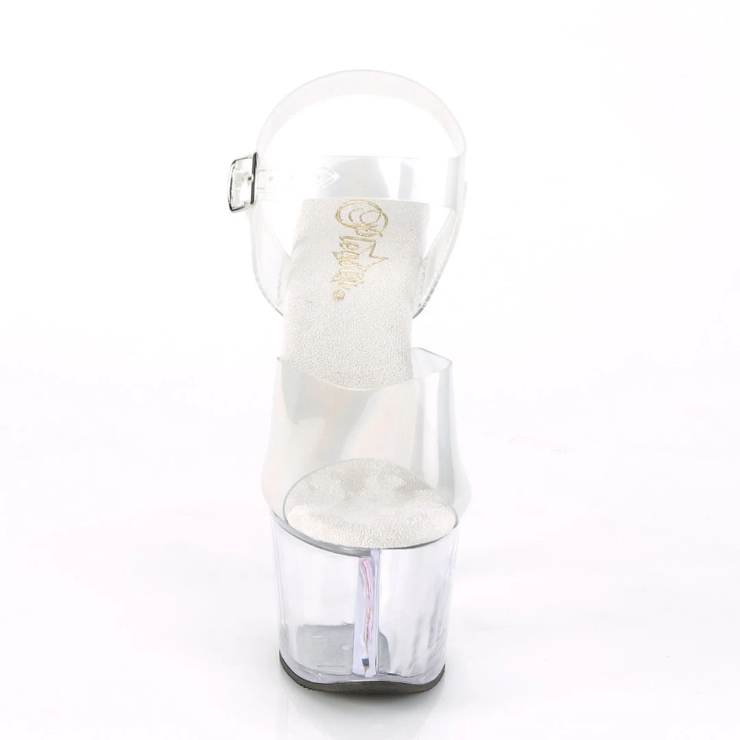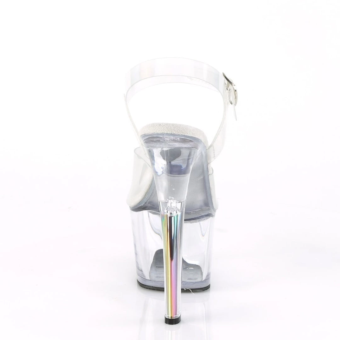 Gorgeous 7″ (178mm) heel, 2 3/4″ (70mm) platform ankle strap sandal featuring rainbow plated steel tubing inside heel.
